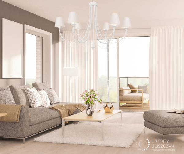 Drugim pytaniem, które powinniśmy sobie zadać dobierając żyrandol do salonu, jest kwestia: – do czego w naszym domu służy salon? Czy jest to miejsce przeznaczone do odpoczynku, czy przestrzeń wykorzystywana także do pracy, czytania i spotkań? Jeśli salon pełni różne funkcje, warto zainwestować w różnorodne źródła światła. Ogromny wybór żyrandoli i lamp znajdziecie w naszym dziale żyrandole do salonu. Na zdjęciach - w roli oświetlenia głównego w salonie - biały żyrandol 6-płomienny Jovesa oraz większy żyrandol 12-płomienny z tej samej serii. Trzecią propozycją jest lampa do mniejszego salonu i jest to żyrandol nowoczesny Ramzo z musztardowymi abażurkami - biała lampa na sufit.