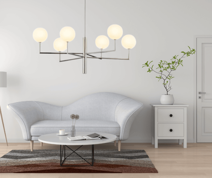 W salonie warto podzielić światło na strefy i stworzyć miejsca, w których będziemy spędzać czas nieco inaczej. Lampy ze szklanymi kulami nadają się do tego doskonale. Łącza w sobie elegancję i nowoczesny styl. Do salonu z łatwością dobierzecie żyrandol z kulami, kinkiety kule i lampę na biurko. Przykładem kompletu lamp kul jest cała seria Febe. Na zdjęciu srebrny żyrandol z białymi kulami Febe.
