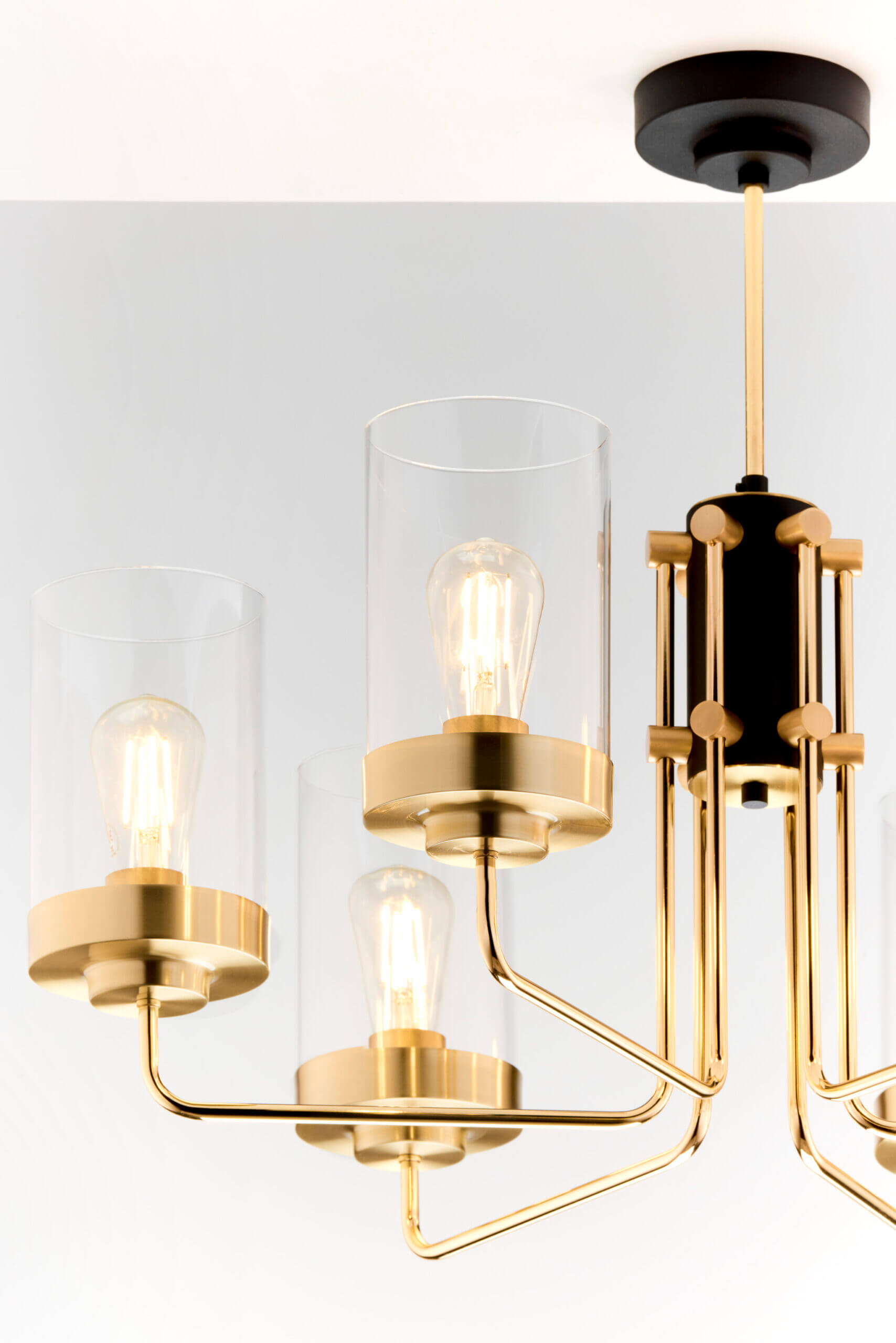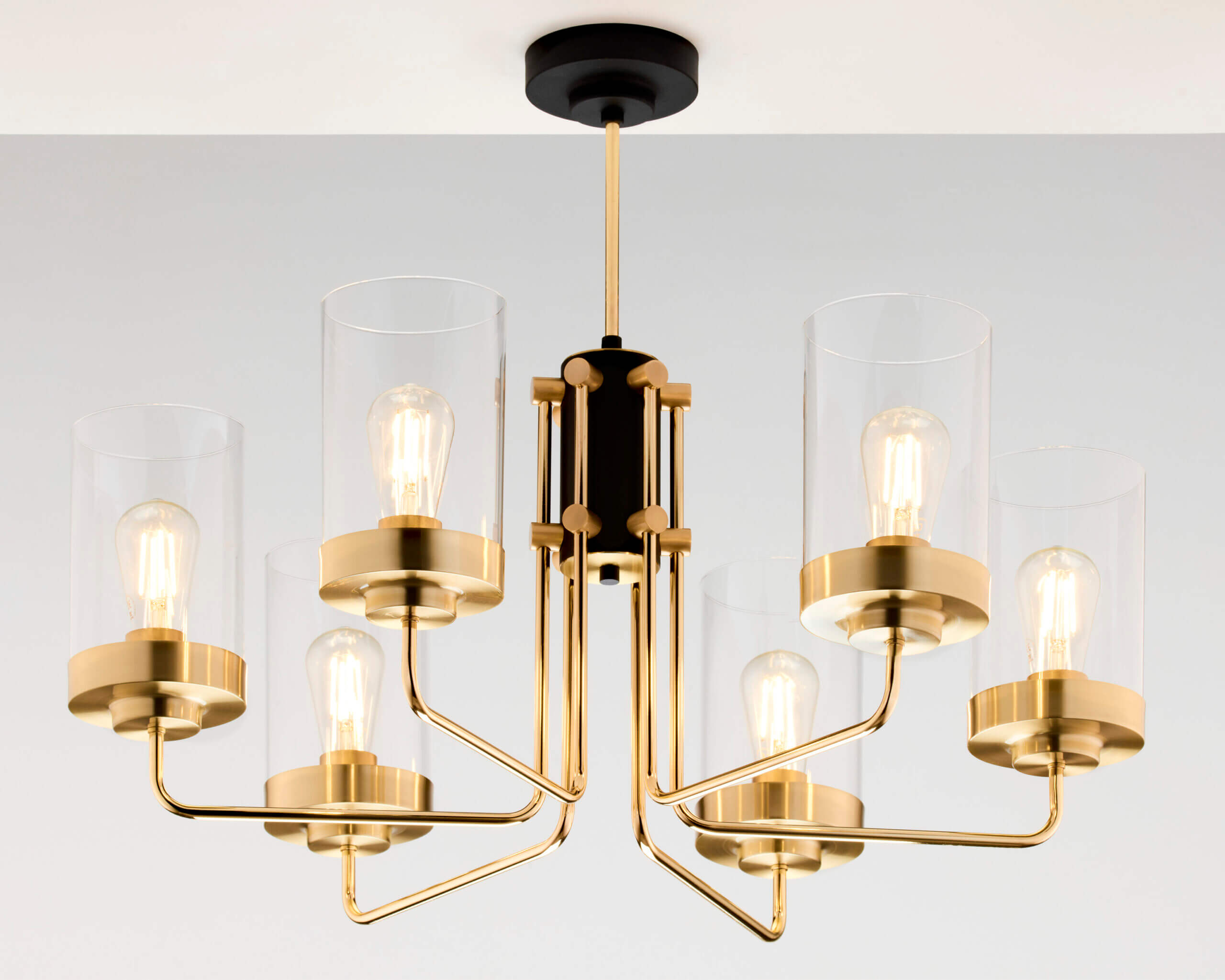 Żyrandol z kloszami Remir, sześcioramienny, w kolorze czarno-złotym, wraz z kloszami bezbarwnymi pięknie będzie oświetlał nieduże salony i pokoje. Lampa przez swoją formę doskonale będzie pasowała do pomieszczeń nowoczesnych, ale również tych bardziej klasycznych.
