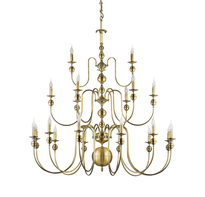 Cezar to żyrandol świecznikowy bardzo dużych rozmiarów. Lampa posiada 21 punków świetlnych, na trzech piętrach i jest mosiężna. Całość oprawy nawiązuje do klasycznych, kutych żyrandoli. Nasza oprawa to bardzo dobra oferta do oświetlenia kościołów, kaplic oraz dworków. Oprawa oświetleniowa ma średnicę 140 cm, a wysokość samego żyrandola to 150 cm. Długość łańcucha jest ustalana indywidualnie, podobnie jak koszt transportu tego bardzo dużego żyrandola.