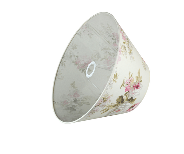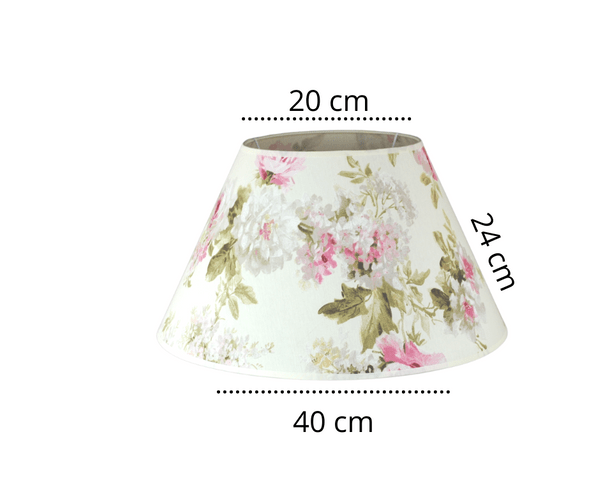 Abażur do lampy podłogowej. Wzór w kwiaty, kształt stożkowy. Nowy abażur doskonale uzupełni i odświeży wygląd lampy podłogowej i innych opraw oświetleniowych. Dodając do lampy nowe abażurki modyfikujemy kształt i charakter naszej "starej" lampy, a poprzez zabawę kolorem abażuru możemy niewielkim kosztem odmienić styl i charakter pomieszczenia.