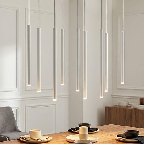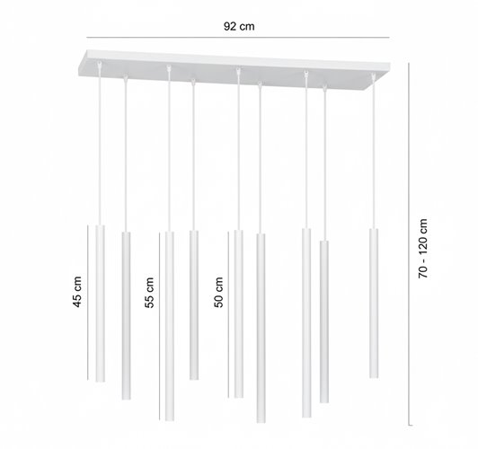 Podłużna lampa sopel Siter to oświetlenie wiszące z 9 rureczkami ledowymi w kolorze białym. Jedna rureczka to jeden punkt światła spot. Wiszący spot wyposażony jest w regulację wysokości. Designerska a zarazem minimalistyczna forma oświetlenia spot sprawdzi się w każdym pomieszczeniu i w różnych stylach wnętrz. Lampa sopel Siter wspaniale prezentuje się w nowoczesnym salonie, a także w pomieszczeniach publicznych - designerskich biurach i kawiarniach. Lampy sople dają skoncentrowane światło, dlatego często służą jako oświetlenie w jadalni lub kuchni nad wyspą kuchenną.
