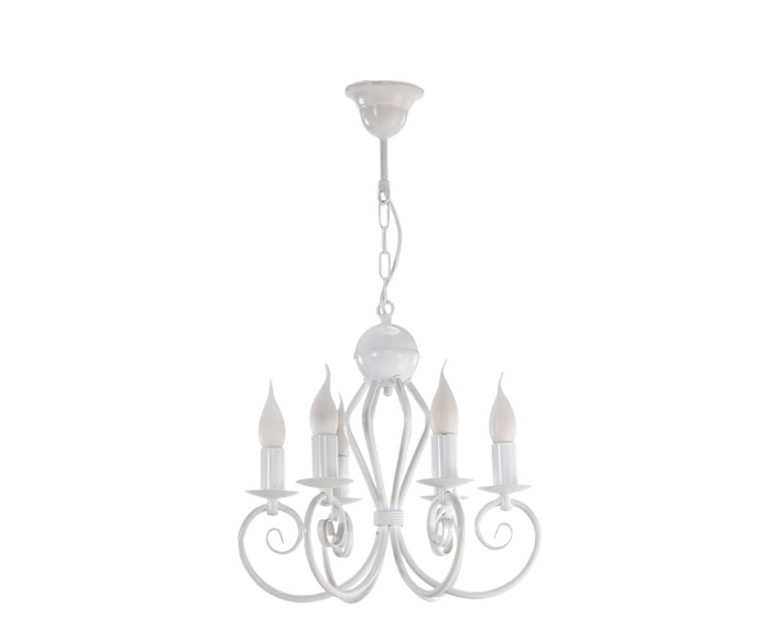 Biały żyrandol świecznikowy Kliwia Calssic White to klasyczna mała lampa wisząca, której piękny kształt tworzy sześć elegancko, subtelnie wygiętych ramion z punktami światła. Lampa pomalowana jest na kolor biały matowy, cała oprawa oświetleniowa ma 62 cm długości, możemy ją zmienić poprzez odjęcie lub dodanie kilku ogniwek łańcucha. Biały żyrandol klasyczny Kliwia wybierany jest często jako romantyczne oświetlenie do sypialni lub jako biała lampa do salonu i pokoju. Biały żyrandol świecznikowy Kliwia doskonale sprawdzi się jako mała biała lampa nad stół, biały żyrandol pięknie prezentuje się również w klasycznym lub nowoczesnym przedpokoju. Biała lampa wisząca pasuje do wnętrz z przewagą jasnych kolorów, a także do pomieszczeń z elementami szarości i beżu. Biały żyrandol z serii Kliwia doskonale wpisuje się w wystrój pomieszczeń urządzonych w stylu shabby chic, prowansalskim i skandynawskim.
