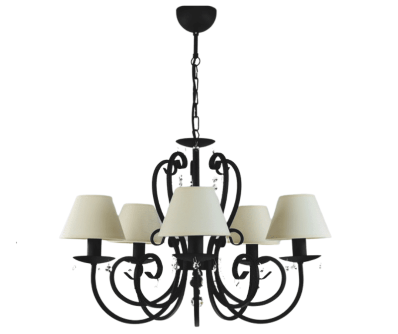 Żyrandol z kryształkami i abażurami Niro to propozycja lampy 5-ramiennej, pomalowanej na kolor czarny. Jest to elegancka lampa z kremowymi abażurami i dużą ilością mieniących się kryształków, które czarnej lampie dodają lekkości i stylu. Ramiona żyrandola wyprodukowane są z profilu o przekroju kwadratowym, co podkreśla jego ręczne wykonanie i nawiązuje do żyrandoli kutych. Czarny żyrandol z kryształkami doskonale rozświetli nawet duże pokoje i salony. Ponadczasowy i uniwersalny kształt abażurowej wiszącej lampy do pokoju podkreśli charakter pomieszczeń urządzonych w stylu klasycznym, tradycyjnym, nowoczesnym i vintage.