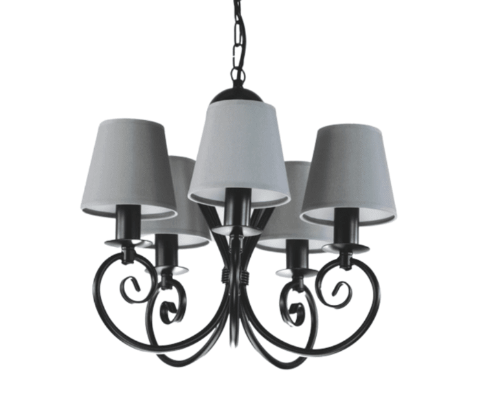 Klasyczny żyrandol pięcioramienny Klinos to nasza Top lampa. O powodzeniu tego modelu żyrandola do salonu decyduje jego ponadczasowy design - klasyczny, zgrabny kształt, który pasuje do wielu stylów wnętrz i nigdy nie wychodzi z mody. Jest to piękna i praktyczna lampa do pokoju. Polecamy ją do niewielkich salonów i pokoi urządzonych w sposób tradycyjny, klasyczny, ale z nutą nowoczesności. Czarny, zwarty stelaż i szare abażurki sprawiają, że stylowy żyrandol pasuje do wielu pokoi, kuchni i małych salonów. Lampa dobrze wpisuje się w charakter wnętrz skandynawskich i nowoczesnych. Szare abażurki łagodnie tłumią światło żarówek i dodają lampie lekkości i wyrazistości. Żyrandol doskonale będzie prezentować się w pokojach, w których dominują dodatki z drewna lub metalowe. Żyrandol ma 66 cm długości, można go skrócić o ok. 10 cm, odejmując trzy oczka łańcucha. Lampę do pokoju można łatwo odmienić dokupując do niej komplet abażurów w innej kolorystyce.