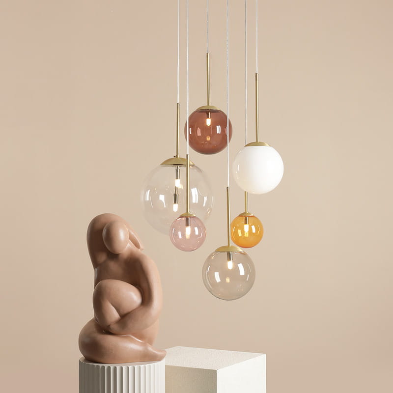 Solo posiada siedem punktów światła, umieszczonych na złotym plafonie. Lampa ma szklane kolorowe klosze i doskonale sprawdzi się jako oświetlenie w pomieszczeniach urządzonych w stylu skandynawskim i modernistycznym. Solo to oprawa oświetleniowa, która często jest wybierana do bardzo wysokich jadalni i salonów. Oprawa ma uniwersalną kolorystykę, a sposób montażu i regulacji długości zawieszenia powodują, że lampa jest wieszana w standardowym budownictwie i w wysokich apartamentach. Lampa ma klosze o średnicy od 14 cm do 20 cm i należy do niej stosować żarówki ledowe G9.