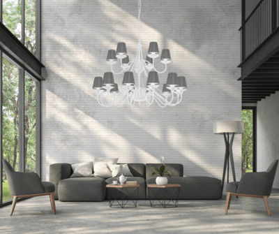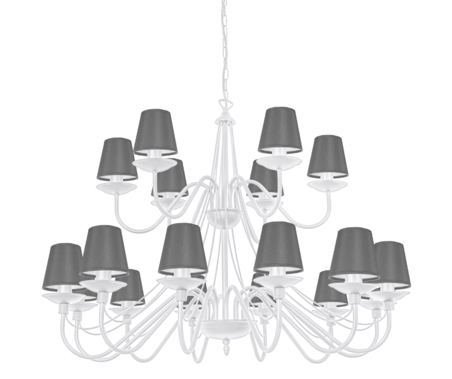 Santa jest żyrandolem dwupoziomowym. Punkty światła zostały rozmieszczone na metalowym stelażu na dwóch piętrach: 12 ramion to poziom dolny, 6 punktów świetlnych to górny poziom żyrandola. Stelaż dużej lampy wiszącej jest wykonany z wysokiej jakości metalu i dodatkowo ozdobiony delikatnymi drucikami, które dodają oprawie lekkości i finezyjnego wyglądu. Konstrukcja żyrandola jest pomalowana na kolor biały. Ten model żyrandola dużego jest wyposażony w eleganckie materiałowe abażurki w kolorze szarym, dzięki czemu światło zyskuje wyjątkowy blask.