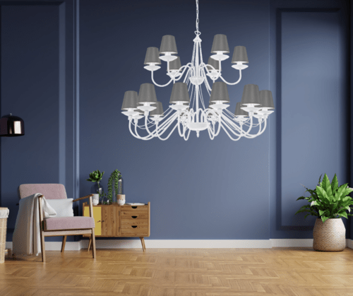 Duży biały żyrandol na 18 żarówek SANTA, lampa pałacowa z szarymi abażurami. Jest to efektowny żyrandol na antresolę lub do salonu, klasyczna wysoka lampa z serii dużych lamp z abażurkami. Elegancki biały żyrandol w stylu prowansalskim, oświetlenie do wysokiego pomieszczenia, do sali balowej lub żyrandol do holu pałacowego.