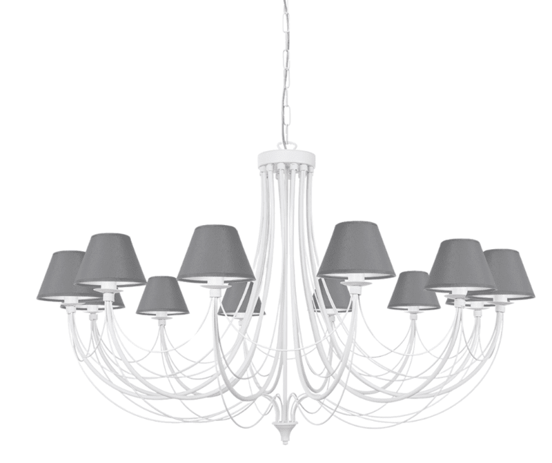 Duża lampa JOVESA w rozmiarze XXL to piękny, biały pałacowy żyrandol z abażurkami o dwunastu ramionach. Średnica lampy to 110 cm. Jest to bardzo okazały biały żyrandol, który doskonale oświetli i ozdobi duży salon, wysoki hol lub eleganckie pomieszczenie hotelowe. Biały duży żyrandol z 12-nastoma punktami światła często jest wybierany jako żyrandol pałacowy do sali balowej lub jako eleganckie oświetlenie klasyczne do sali przyjęć. Żyrandol ma wysokość 170 cm, składa się na nią stelaż - 70 cm oraz łańcuch w standardowej długości 1 m. Jeśli Wasze pomieszczenie jest bardzo wysokie to wystarczy do nas napisać - na zamówienie wydłużymy łańcuch żyrandola o kolejne ogniwa, dzięki czemu lampa zawiśnie na odpowiedniej wysokości. A jeżeli łańcuch jest zbyt długi, to samodzielnie możecie go skrócić odejmując kolejne ogniwa. Minimalna wysokość żyrandola z dwoma ogniwami łańcucha to w sumie 80 cm. Duży żyrandol pałacowy JOVESA zachwyca pięknym kształtem klasycznego stelaża, gięte ramiona dodają białemu świecznikowi lekkości i wyjątkowego charakteru. Jest to bardzo elegancka, a jednocześnie finezyjna w formie duża biała lampa świecznikowa z eleganckimi szarymi abażurkami.