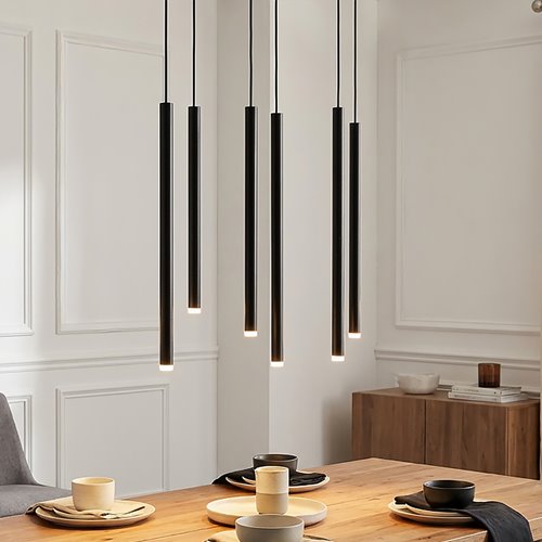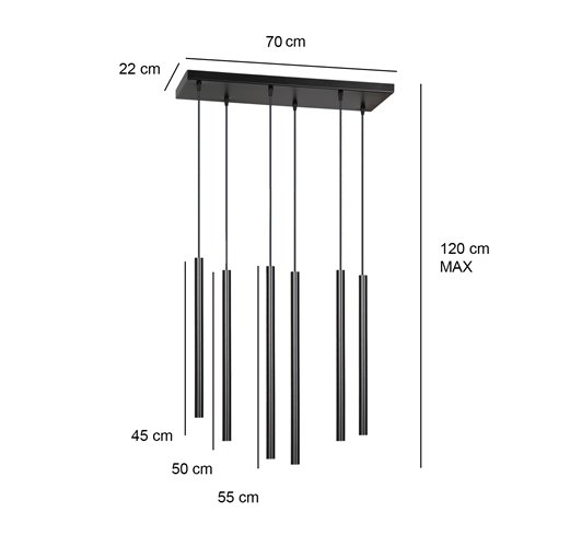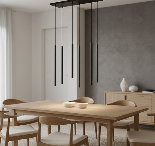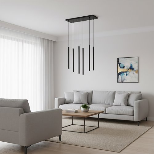 Podłużna lampa sopel Siter to oświetlenie wiszące z 6 rureczkami ledowymi w kolorze czarnym. Jedna rureczka to jeden punkt światła spot. Wiszący spot wyposażony jest w regulację wysokości. Designerska a zarazem minimalistyczna forma oświetlenia spot sprawdzi się w każdym pomieszczeniu i w różnych stylach wnętrz. Lampa sopel Siter wspaniale prezentuje się w nowoczesnym salonie, a także w pomieszczeniach publicznych - designerskich biurach i kawiarniach. Lampy sople dają skoncentrowane światło, dlatego często służą jako oświetlenie w jadalni lub kuchni nad wyspą kuchenną.