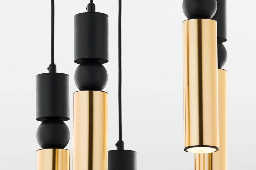 Nowoczesna lampa spot Talas to oświetlenie wiszące z 5 tubami- rurkami ledowymi w kolorze czarnym ze złotymi elementami. Jedna tuba to jeden punkt światła spot. Wyrafinowanej elegancji dodają lampie złote dodatki: metalowa, mosiądzowana kulka rozdzielająca tubę oświetleniową na dwie części oraz złote wykończenie metalowego klosza. Efektowny jest również czarny stelaż lampy ze spotami. W przypadku tego modelu spoty podwieszone są do czarnego okrągłego dekla montowanego do sufitu. Spoty podwieszone są na różnych długościach kabla, co jest dodatkowym elementem dekoracyjnym oświetlenia. Lampa wiszący spot wyposażona jest w regulację wysokości. Designerska a zarazem minimalistyczna forma oświetlenia spot sprawdzi się w każdym pomieszczeniu i w różnych stylach wnętrz. Jest to okrągła lampa do pomieszczeń nowoczesnych i oświetlenie do wnętrz w stylu glamour. Lampa spot Talas wspaniale prezentuje się w nowoczesnym salonie, a także w designerskich biurach czy kawiarniach. Lampy tuby dają skoncentrowane światło, dlatego w domu często służą jako oświetlenie w jadalni lub w kuchni nad wyspą kuchenną. Lampa spot Talas jest również dostępna w wersji z 5 tubami.