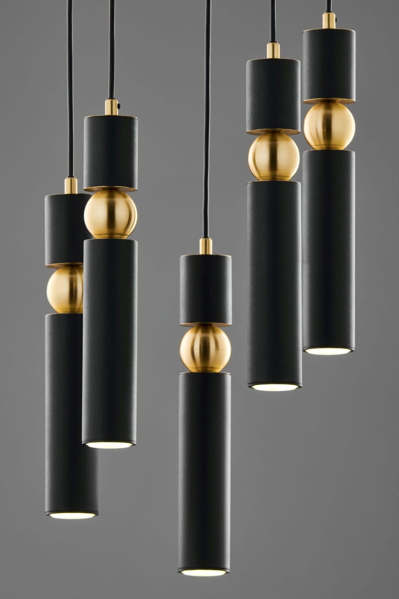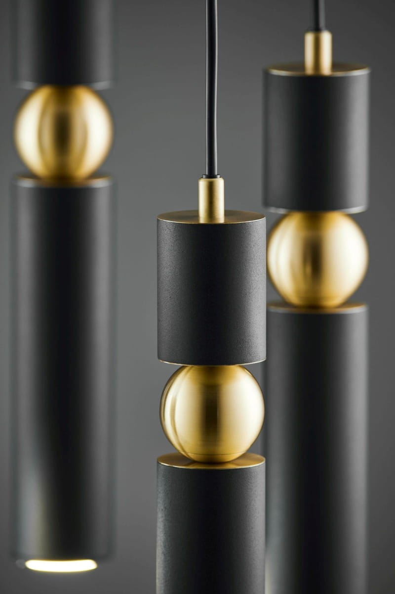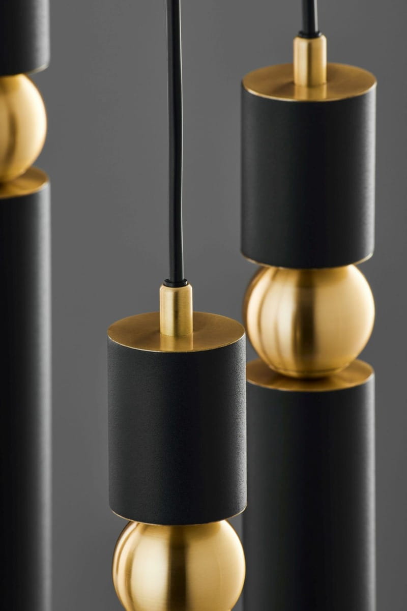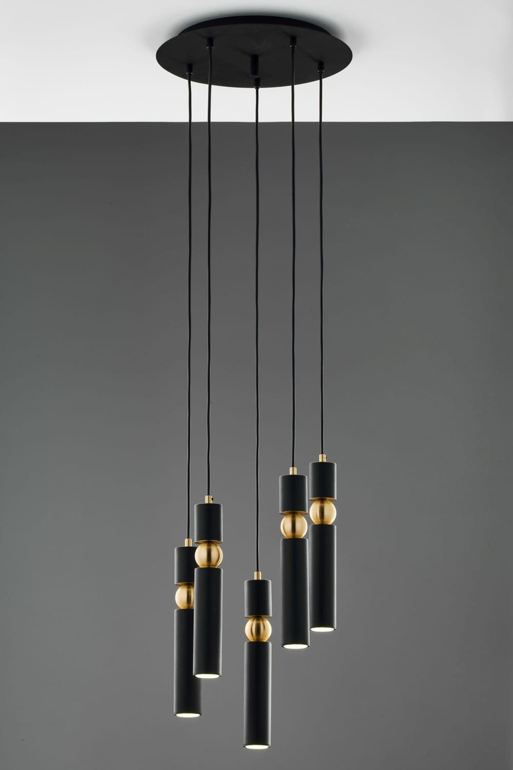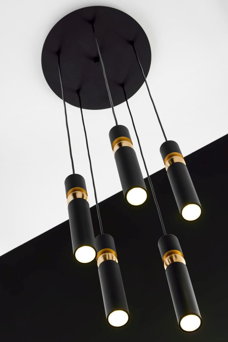 Nowoczesna lampa spot Talas to oświetlenie wiszące z 5 tubami ledowymi w kolorze czarnym ze złotymi elementami. Jedna tuba to jeden punkt światła spot. Wyrafinowanej elegancji dodają lampie złote dodatki: metalowa, mosiądzowana kulka rozdzielająca tubę oświetleniową na dwie części oraz złote wykończenie metalowego klosza. Efektowny jest również czarny stelaż lampy ze spotami. W przypadku tego modelu spoty podwieszone są do czarnego okrągłego dekla montowanego do sufitu. Spoty podwieszone są na różnych długościach kabla, co jest dodatkowym elementem dekoracyjnym oświetlenia. Lampa wiszący spot wyposażona jest w regulację wysokości. Designerska a zarazem minimalistyczna forma oświetlenia spot sprawdzi się w każdym pomieszczeniu i w różnych stylach wnętrz. Jest to okrągła lampa do pomieszczeń nowoczesnych i oświetlenie do wnętrz w stylu glamour. Lampa spot Talas wspaniale prezentuje się w nowoczesnym salonie, a także w designerskich biurach czy kawiarniach. Lampy tuby dają skoncentrowane światło, dlatego w domu często służą jako oświetlenie w jadalni lub w kuchni nad wyspą kuchenną. Lampa spot Talas jest również dostępna w wersji z 5 tubami.