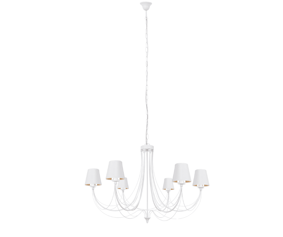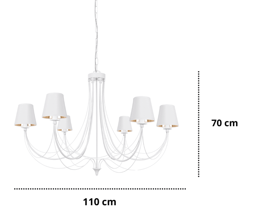 Klasyczny biały żyrandol JOVESA na sześć punktów światła to bardzo piękny duży żyrandol do salonu. Biała lampa z eleganckimi ramionami i stylowymi abażurami świetnie dopasuje się do wnętrz w stylu klasycznym jak i nowoczesnym. Żyrandol 6-ramienny można powiesić w obszernym holu lub umieścić jako oświetlenie główne w dużym salonie. Żyrandol doskonale sprawdzi się również jako duża biała lampa nad stół w stylowej jadalni. Duża lampa świecznikowa z czarno-złotymi abażurkami i giętymi ramionami, dzięki swoim wymiarom, doskonale oświetli nawet największe pomieszczenia. Żyrandol ma 110 cm średnicy, a jego długość całkowitą (170 cm) możemy zwiększyć, dodając dowolną ilość oczek łańcucha. Sam stelaż lampy ma 70 cm wysokości, a jego minimalna całkowita długość wraz z 2 oczkami łańcucha to 80 cm. Korekty długości łańcucha żyrandola można dokonać samodzielnie podczas montażu lampy. Biały żyrandol Jovesa to lampa klasyczna w formie. Lekkości dodają jej ładnie wygięte ramiona, dodatkowo ozdobione delikatnymi drucikami. Dzięki finezyjnym detalom duża lampa do salonu doskonale pasuje do jasnych, nowoczesnych wnętrz, którym dodaje unikalnego stylu. W tym egzemplarzu żyrandola warto zwrócić uwagę na piękne abażurki w kolorze czarno-złotym, które delikatnie rozpraszają światło żarówek stylowej lampy.