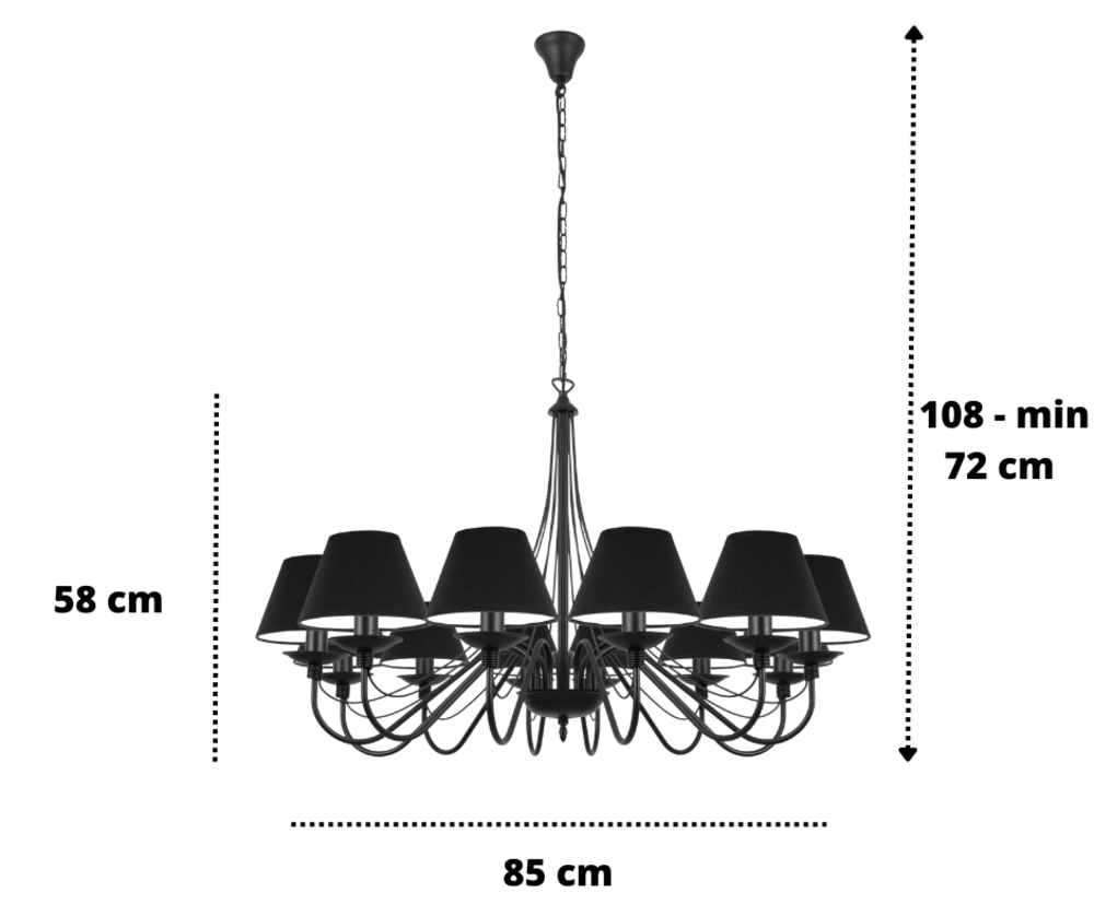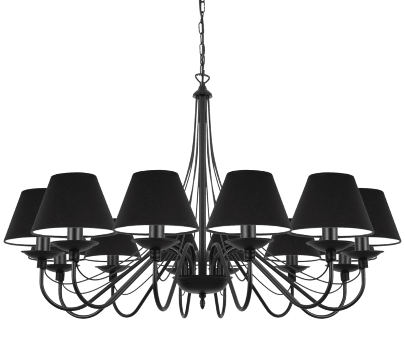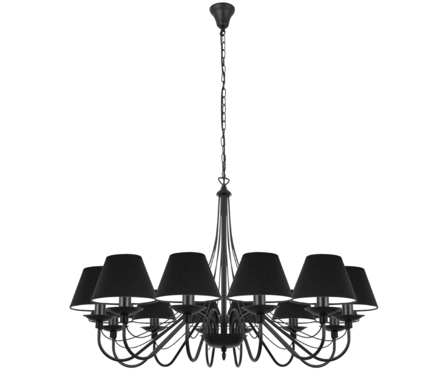 Jeżeli chcecie postawić na coś wyjątkowego, to klasyczny, efektowny duży żyrandol z abażurami w kolorze czarnego matu będzie idealnym wyborem. Kupując lampę wiszącą, stawiasz na ponadczasowy kształt i formę oświetlenia oraz otrzymujesz gwarancję jakości. Okazały, elegancki i stylowy żyrandol o dużych rozmiarach, to znakomity pomysł na oświetlenie i ozdobę salonu. Lampa ma 85 cm średnicy, a jej całkowitą długość możemy zmienić, dodając odpowiednią ilość ogniwek łańcucha. Santa jest częstym "gościem" w wysokich salonach, salach i pomieszczeniach gastronomicznych. W tym dużym żyrandolu wiszącym abażury w kolorze czarnym są w odpowiednich i proporcjonalnych wymiarach, a dzięki nim światło żarówki równomiernie rozprasza się, nie rażąc oczu. Lampa ta bardzo często wieszana jest w pomieszczeniach o stylu tradycyjnym, prowansalskim i klasycznym, ale doskonale też zaprezentuje się w nowoczesnych salonach, bo jej ponadczasowość i dobry styl jest oczywista.