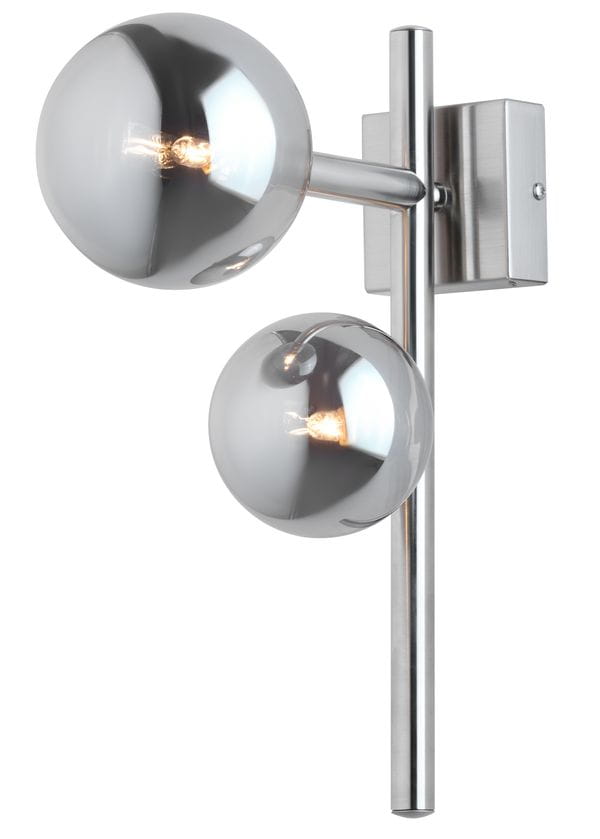 Srebrny - niklowany kinkiet Naptun to propozycja do nowoczesnych pomieszczeń. Oprawa to designerska propozycja lampy przyściennej, która odnajdzie swoje przeznaczenie w salonach urządzonych w stylu nowoczesnym i minimalistycznym. Kinkiet wewnętrzny niklowany efektownie doświetli boczne miejsca w naszych domach, do których światło nowoczesnych żyrandoli dociera zbyt słabo. Lampa naścienna ma dwa klosze dymne w kształcie kulek, które równomiernie rozpraszają światło żarówek. Neptun pięknie będzie wyglądać z innymi oprawami oświetleniowymi z tej serii, pełniąc rolę użytkową i dekoracyjną.