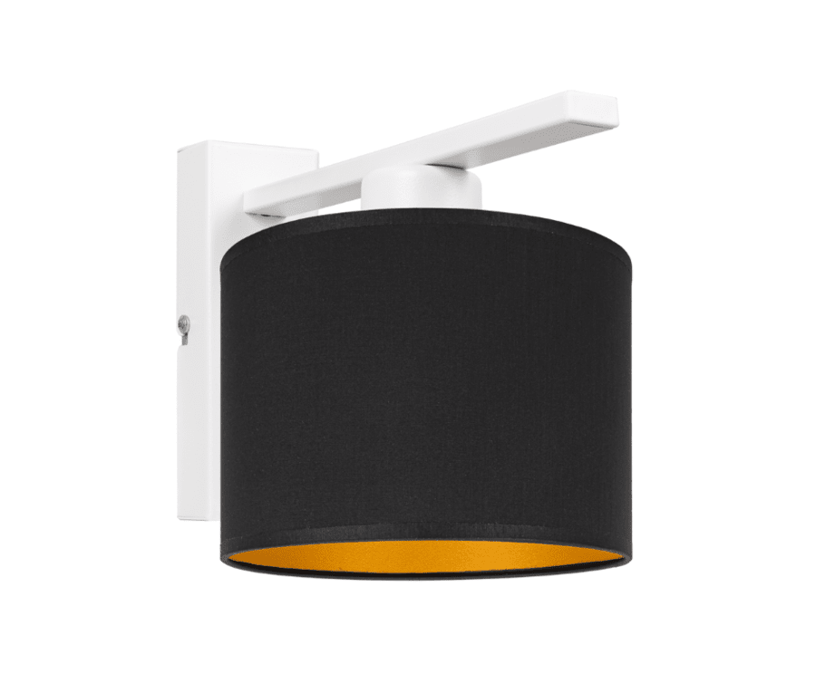 Biały kinkiet z czarno-złotym abażurem Erik to propozycja estetycznego oświetlenia na ścianę do pomieszczeń nowoczesnych. Lampa ścienna na jedną żarówkę doskonale sprawdzi się jako nowoczesny kinkiet w przedpokoju, jako lampa ścienna z abażurem w sypialni, uzupełni centralne oświetlenie z abażurami w salonie. Kinkiet Erik składa się z prostego metalowego stelaża montowanego do ściany i dość dużego czarno-złotego abażuru w kształcie walca. Abażur jest wykonany z eleganckiej tkaniny, która przepuszcza światło, a jednocześnie delikatnie je tłumi, co sprzyja budowaniu domowego klimatu w pomieszczeniu. Jest to bardzo proporcjonalna i ciekawa w formie nowoczesna lampa na ścianę z pięknym abażurem. Jako producent oświetlenia i sklep fabryczny z lampami doskonale wiemy, jak ważne są kinkiety we wnętrzach. Te niewielkie lampy ścienne doświetlają miejsca, których nie jesteśmy w stanie odpowiednio oświetlić żyrandolem czy lampą powieszoną centralnie. Kinkiet z abażurem Erik to nowość w naszej ofercie kinkietów do salonu i pokoju.