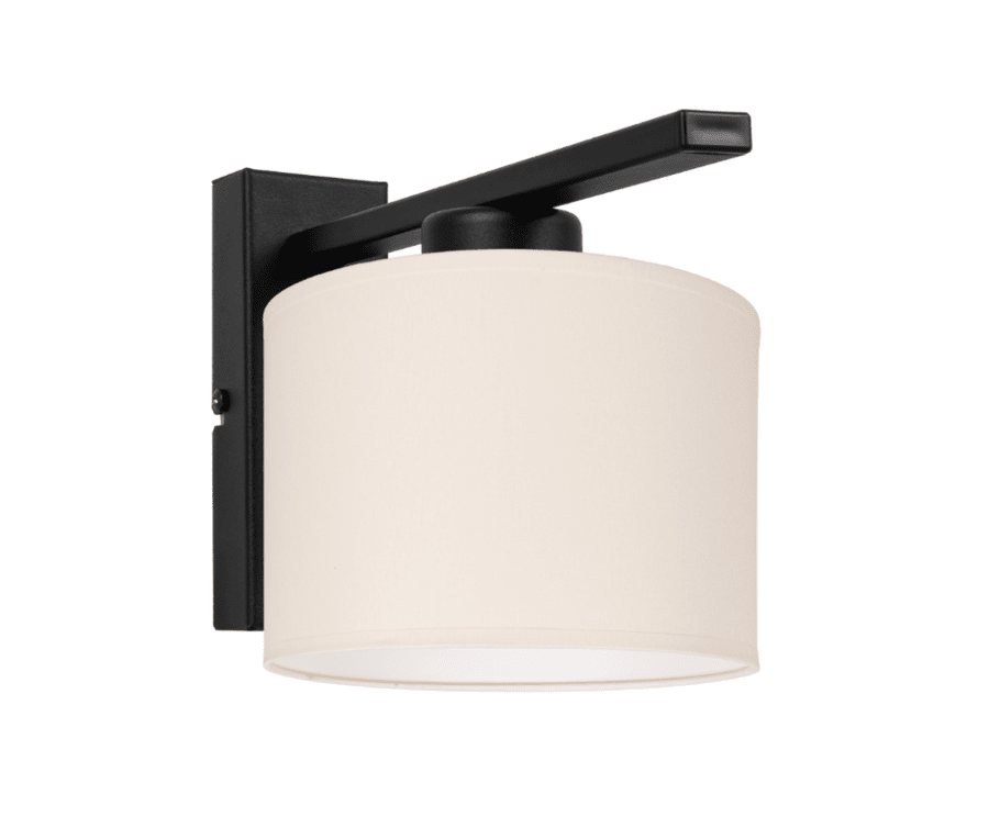 Czarny kinkiet z kremowym abażurem Erik to propozycja estetycznego oświetlenia na ścianę do pomieszczeń nowoczesnych. Lampa ścienna na jedną żarówkę doskonale sprawdzi się jako nowoczesny kinkiet w przedpokoju, jako lampa ścienna z abażurem w sypialni, uzupełni centralne oświetlenie z abażurami w salonie. Kinkiet Erik składa się z prostego metalowego stelaża montowanego do ściany i dość dużego ecru abażuru w kształcie walca. Abażur jest wykonany z eleganckiej tkaniny, która przepuszcza światło, a jednocześnie delikatnie je tłumi, co sprzyja budowaniu domowego klimatu w pomieszczeniu. Jest to bardzo proporcjonalna i ciekawa w formie nowoczesna lampa na ścianę z pięknym abażurem. Jako producent oświetlenia i sklep fabryczny z lampami doskonale wiemy, jak ważne są kinkiety we wnętrzach. Te niewielkie lampy ścienne doświetlają miejsca, których nie jesteśmy w stanie odpowiednio oświetlić żyrandolem czy lampą powieszoną centralnie. Kinkiet z abażurem Erik to nowość w naszej ofercie kinkietów do salonu i pokoju.