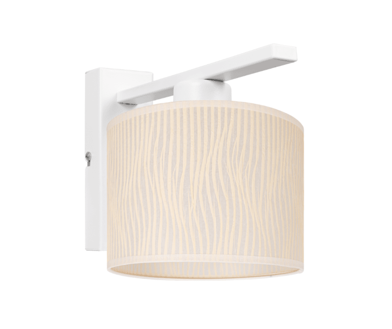 Biały kinkiet z abażurem kremowym w paski Erik to propozycja estetycznego oświetlenia na ścianę do pomieszczeń nowoczesnych. Lampa ścienna na jedną żarówkę doskonale sprawdzi się jako nowoczesny kinkiet w przedpokoju, jako lampa ścienna z abażurem w sypialni, uzupełni centralne oświetlenie z abażurami w salonie. Kinkiet Erik składa się z prostego metalowego stelaża montowanego do ściany i dość dużego ecru abażuru w kształcie walca. Abażur jest wykonany z eleganckiej tkaniny, co sprzyja budowaniu domowego klimatu w pomieszczeniu. Jest to bardzo proporcjonalna i ciekawa w formie nowoczesna lampa na ścianę z pięknym abażurem. Jako producent oświetlenia i sklep fabryczny z lampami doskonale wiemy, jak ważne są kinkiety we wnętrzach. Te niewielkie lampy ścienne doświetlają miejsca, których nie jesteśmy w stanie odpowiednio oświetlić żyrandolem czy lampą powieszoną centralnie. Kinkiet z abażurem Erik to nowość w naszej ofercie kinkietów do salonu i pokoju.
