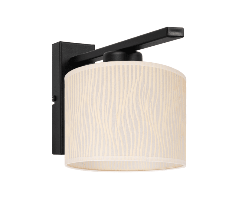 Czarny kinkiet z abażurem kremowym w paski Erik to propozycja estetycznego oświetlenia na ścianę do pomieszczeń nowoczesnych. Lampa ścienna na jedną żarówkę doskonale sprawdzi się jako nowoczesny kinkiet w przedpokoju, jako lampa ścienna z abażurem w sypialni, uzupełni centralne oświetlenie z abażurami w salonie. Kinkiet Erik składa się z prostego metalowego stelaża montowanego do ściany i dość dużego ecru abażuru w kształcie walca. Abażur jest wykonany z eleganckiej tkaniny, co sprzyja budowaniu domowego klimatu w pomieszczeniu. Jest to bardzo proporcjonalna i ciekawa w formie nowoczesna lampa na ścianę z pięknym abażurem. Jako producent oświetlenia i sklep fabryczny z lampami doskonale wiemy, jak ważne są kinkiety we wnętrzach. Te niewielkie lampy ścienne doświetlają miejsca, których nie jesteśmy w stanie odpowiednio oświetlić żyrandolem czy lampą powieszoną centralnie. Kinkiet z abażurem Erik to nowość w naszej ofercie kinkietów do salonu i pokoju.