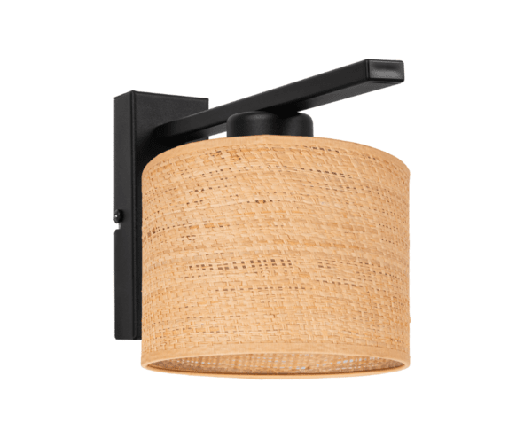 Czarny kinkiet z abażurem z rattanu Erik to propozycja estetycznego oświetlenia na ścianę do pomieszczeń nowoczesnych. Lampa ścienna na jedną żarówkę doskonale sprawdzi się jako nowoczesny kinkiet w przedpokoju, jako lampa ścienna z abażurem w sypialni, uzupełni centralne oświetlenie z abażurami w salonie. Kinkiet Erik składa się z prostego metalowego stelaża montowanego do ściany i dość dużego abażuru z rattanu w kształcie walca. Abażur jest wykonany z eleganckiej tkaniny, co sprzyja budowaniu domowego klimatu w pomieszczeniu. Jest to bardzo proporcjonalna i ciekawa w formie nowoczesna lampa na ścianę z pięknym abażurem. Jako producent oświetlenia i sklep fabryczny z lampami doskonale wiemy, jak ważne są kinkiety we wnętrzach. Te niewielkie lampy ścienne doświetlają miejsca, których nie jesteśmy w stanie odpowiednio oświetlić żyrandolem czy lampą powieszoną centralnie. Kinkiet z abażurem Erik to nowość w naszej ofercie kinkietów do salonu i pokoju.