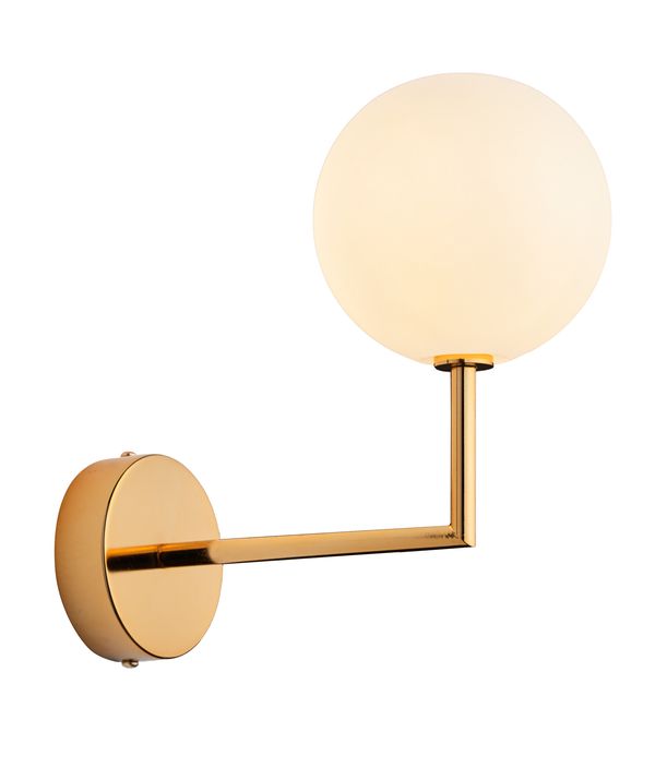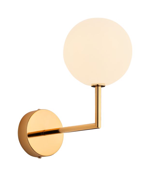 Kinkiet Febe to nowoczesny kształt i forma oprawy, lampka boczna do salonów i pokoi. Stelaż tej oprawy oświetleniowej jest mosiężny. Szklana kulka ma barwę mlecznobiałą, ładnie i równomiernie rozprasza światło żarówki. Febe nie razi przesadną dekoracyjnością. Modny design wypływa z harmonii prostoty. Kinkiet ma uniwersalną kolorystykę do różnych stylów wnętrz.