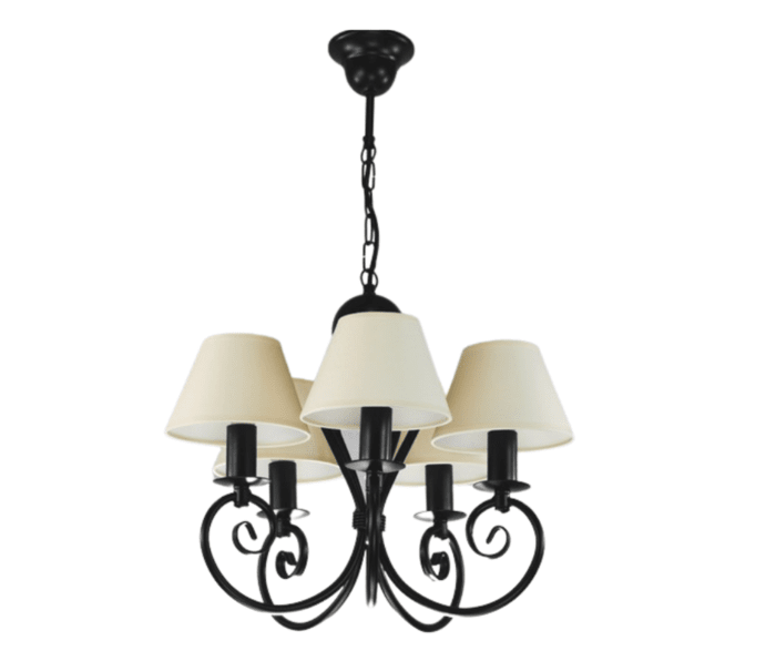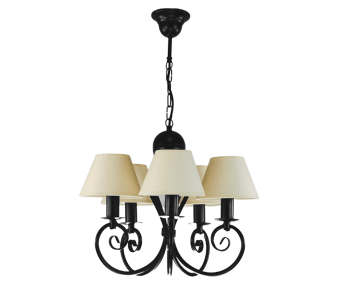 Klasyczny żyrandol pięcioramienny Klinos to nasza Top lampa. O powodzeniu tego modelu żyrandola do salonu decyduje jego ponadczasowy design - klasyczny zgrabny kształt, który pasuje do wielu stylów wnętrz i nigdy nie wychodzi z mody. Jest to piękna i praktyczna lampa do pokoju. Polecamy ją do niewielkich salonów i pokoi urządzonych w sposób tradycyjny, klasyczny, ale z nutą nowoczesności. Czarny stelaż i abażurki w kolorze ecru sprawiają, że stylowy żyrandol pasuje do pokoi, kuchni i małych salonów. Lampa dobrze wpisuje się w styl wnętrz skandynawskich. Doskonale będzie prezentować się w pokojach, w których dominują dodatki z drewna i jasne, pastelowe kolory. Żyrandol można skrócić o ok. 10 cm, odejmując trzy ogniwka łańcucha. Lampę do pokoju można łatwo odmienić dokupując do niej komplet abażurów w innej kolorystyce.