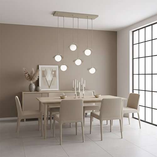 Lampa wisząca MEWA 6-punktowa to nowoczesne oświetlenie sufitowe, które przyciąga uwagę lekką formą i subtelnym designem. Model wyposażony w sześć punktów światła z beżowym stelażem i białymi kulami szklanymi prezentuje się elegancko i nowocześnie, dzięki czemu doskonale wpisuje się w modne aranżacje salonu, jadalni czy kuchni. Beżowa konstrukcja i delikatne przewody nadają lampie wizualnej lekkości, a całość tworzy efektowną, nienachalną dekorację wnętrza. Nowoczesna beżowa lampa z kulami szklanymi MEWA świetnie sprawdzi się we wnętrzach urządzonych w stylu minimalistycznym, soft modern, japandi oraz nowoczesnym. To designerska lampa wisząca nad stół, która nie tylko dobrze oświetla przestrzeń, ale także podkreśla charakter aranżacji. Szklane kule pięknie rozpraszają światło, pomagając stworzyć przyjemną atmosferę w pomieszczeniu. Lampa 6-punktowa MEWA będzie doskonałym wyborem dla osób, które szukają beżowej lampy wiszącej do salonu lub stylowego oświetlenia do nowoczesnej jadalni. To połączenie estetyki, funkcjonalności i modnej formy, które sprawia, że lampa staje się ważnym elementem wystroju. Beżowa lampa sufitowa z kulami doda wnętrzu ciepła i lekkości.