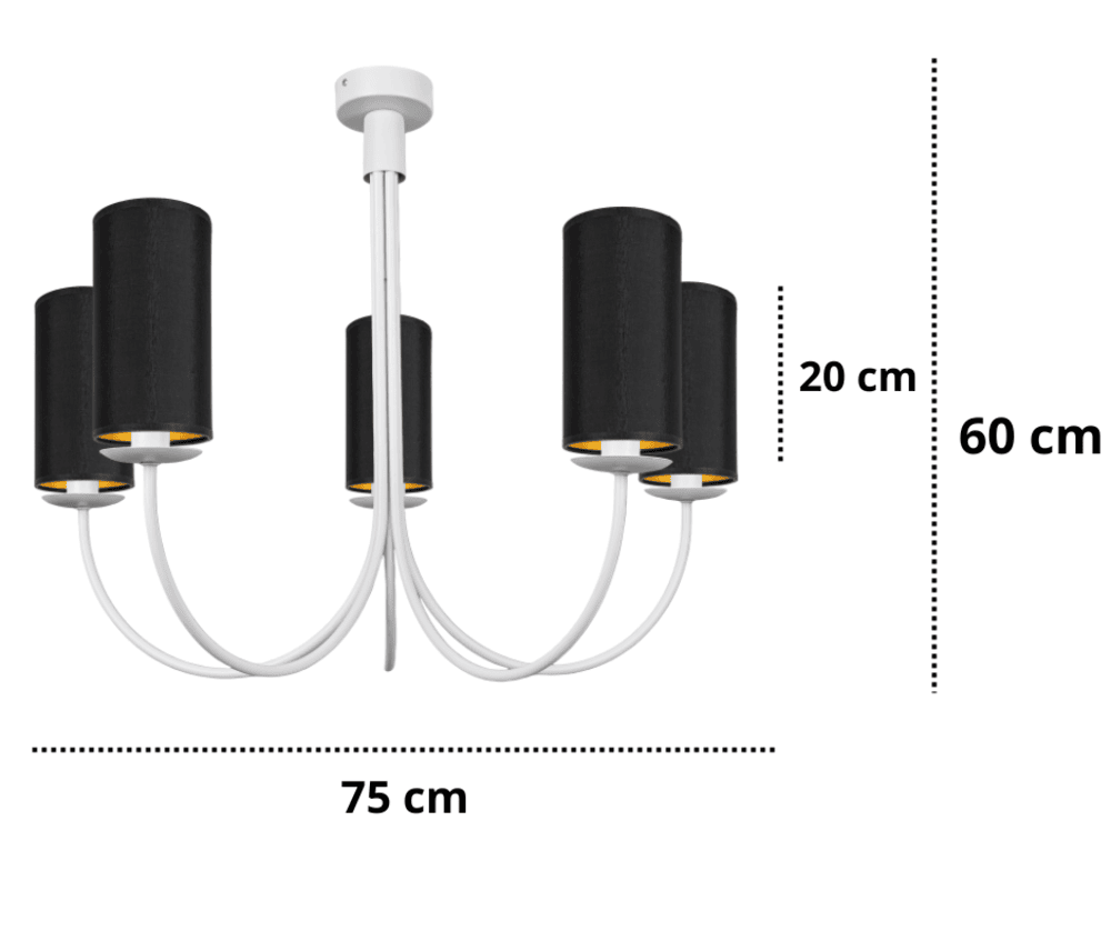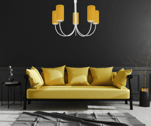 Duży żyrandol na sufit 5-ramienny to wyjątkowo piękne i eleganckie białe oświetlenie do salonu. Żyrandol Ramzo wyposażony jest w zgrabny stelaż, który ozdabiają subtelnie wygięte ramiona, zakończone punktami światła. W tym modelu żarówki są osłonięte eleganckimi abażurkami z tkaniny z zamszu. Kształt i modny kolor abażurków nadaje żyrandolowi nowoczesny charakter. Biała lampa klasyczna Ramzo z musztardowymi abażurami zachwyca prostotą, blaskiem i świetnym stylem. Oprawa przywodzi na myśl tradycyjne oświetlenie dawnych salonów, ale ze względu na kształt ramion i kolor abażurów, żyrandol wiszący z powodzeniem wpisuje się w wystrój wnętrz nowoczesnych i skandynawskich.