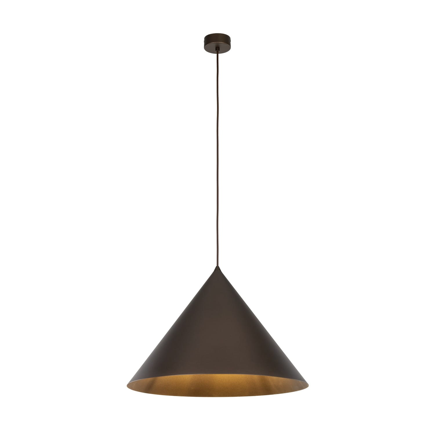 Zwis loftowy Kana to bardzo ciekawy projekt lampy wiszącej pojedynczej. Oprawa składa się z długiego przewodu i metalowego klosza w kształcie stożka o średnicy 50 cm, pomalowanego na oryginalny kolor wenge. Metalowy stożek to jeden punkt światła. Kana to pojedyncza oprawa o prostej, a jednocześnie przykuwającej uwagę formie. Ciemno - brązowa, geometryczna lampa doskonale sprawdzi się w nowoczesnych czy modernistycznych wnętrzach. Zwis pojedynczy wenge będzie świetnie wyglądał, jeśli umieścimy go we wnętrzu w serii takich samych lamp pojedynczych. Multiplikacja jednakowych punktów światła daje doskonały efekt aranżacyjny. Zwis w kolorze wenge Kana jest wybierany jako pojedyncze oświetlenie do pokoi młodzieżowych, jako lampa do kolorowego pokoju, a także jako pojedyncza lampa wisząca do nowoczesnych kawiarni i pubów. Lampa geometryczna Kana to jeden z modeli w serii nowatorskich lamp kolorowych do wnętrz nowoczesnych.