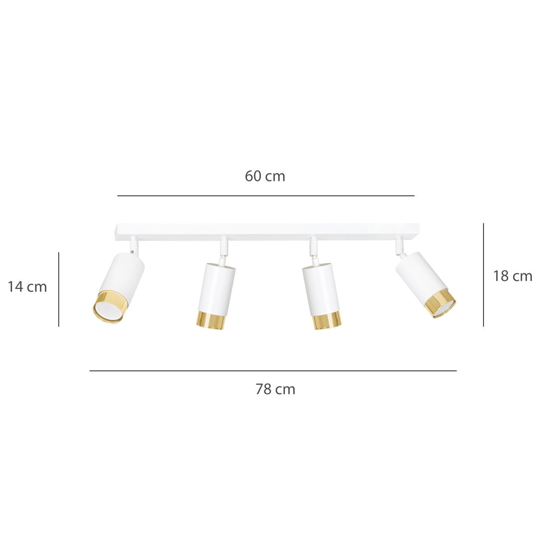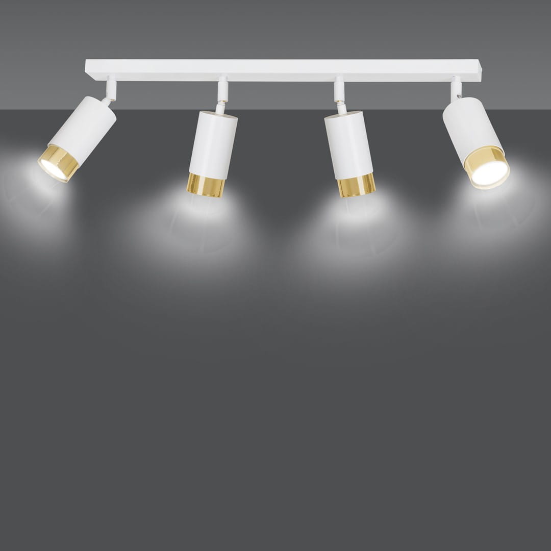 Lampa sufitowa Heros to propozycja nowoczesnej oprawy na sufit w kolorze białym matowym i złotym. Jest uniwersalnym i praktycznym źródłem światła. Posiada cztery regulowane reflektorki, dzięki którym strumień światła możemy ustawić pod dowolnym kątem. Heros może być głównym oświetleniem w pokoju, kuchni czy łazience, albo pełnić rolę dodatkowego źródła światła. Ta lampa pod sufit najbardziej sprawdzi się w niewysokich pomieszczeniach, urządzonych w różnych stylach i aranżacjach, albo w pomieszczeniach biurowych. Charakteryzuje się funkcjonalnością. W lampie Heros źródłem światła są żarówki ledowe, co jest rozwiązaniem ekonomicznym i ekologicznym.