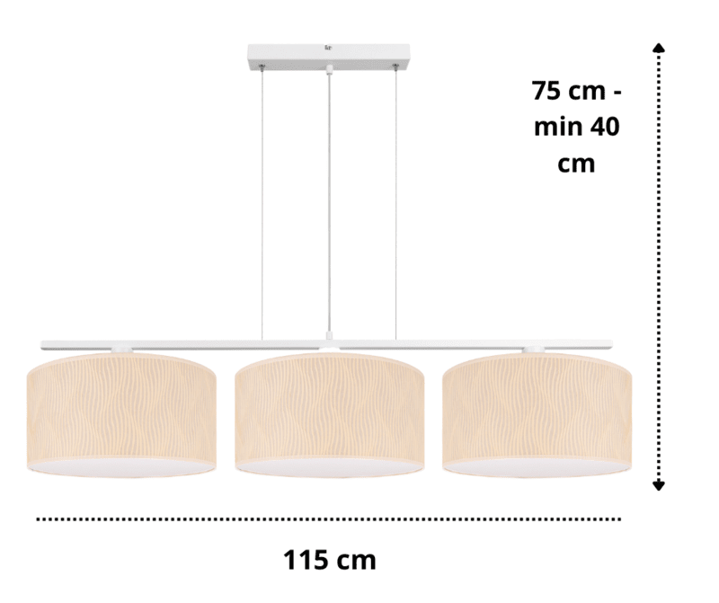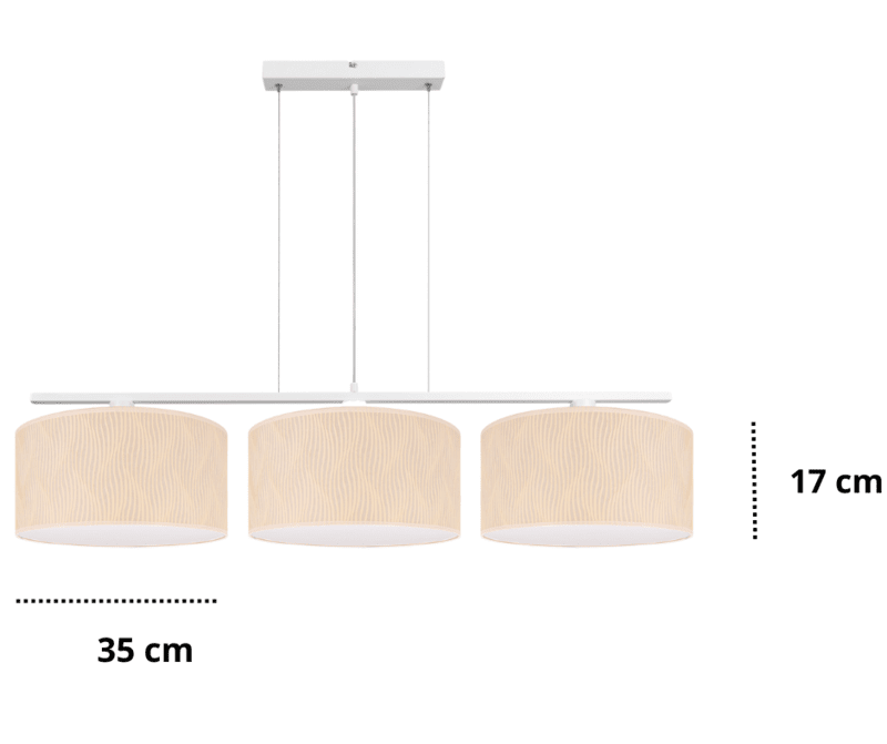 Lampa wisząca Werika z dużymi jasnymi abażurami z delikatnym wzorem to oświetlenie do jasnego salonu, przytulnego pokoju dziennego lub stylowej sypialni w kolorach kremu. Jest to szeroka lampa z trzema dużymi abażurami w kształcie walca. Konstrukcja lampy wiszącej zachwyca prostotą, stabilnością i designerskim charakterem.