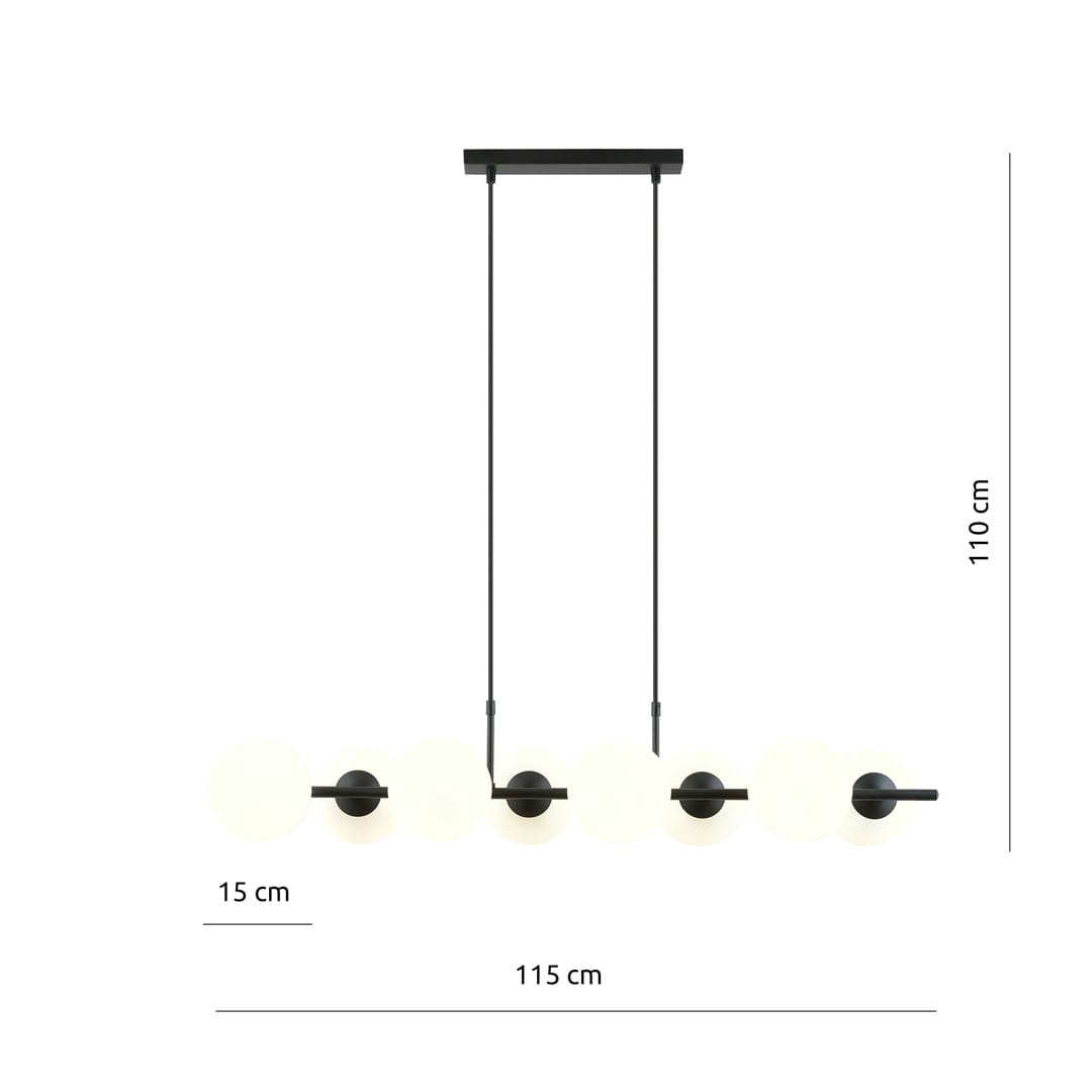 Romos to nasza TOP lampa kula, która wyposażona jest w osiem punktów światła umieszczonych na czarnym stelażu. Lampa ma szklane mlecznobiałe klosze. Lampa kula doskonale sprawdzi się jako oświetlenie w pomieszczeniach urządzonych w stylu nowoczesnym. Romos to oprawa oświetleniowa, która często jest wybierana do jadalni, salonów i pokoi młodzieżowych. Posiada regulowaną wysokość. Oprawa ma uniwersalną kolorystykę, a sposób montażu i regulacji długości zawieszenia powodują, że lampa jest wieszana w standardowym budownictwie i w wysokich apartamentach. Prosta, a za razem funkcjonalna forma oświetlenia z szklanymi grafitowymi bańkami - kloszami.