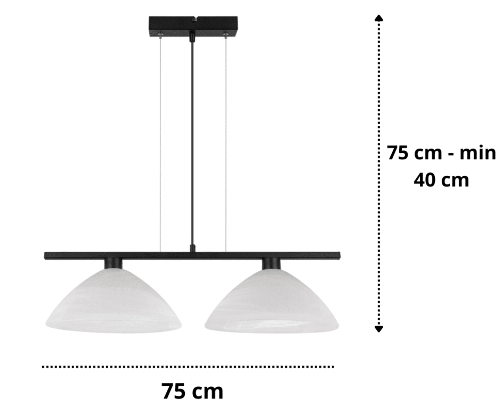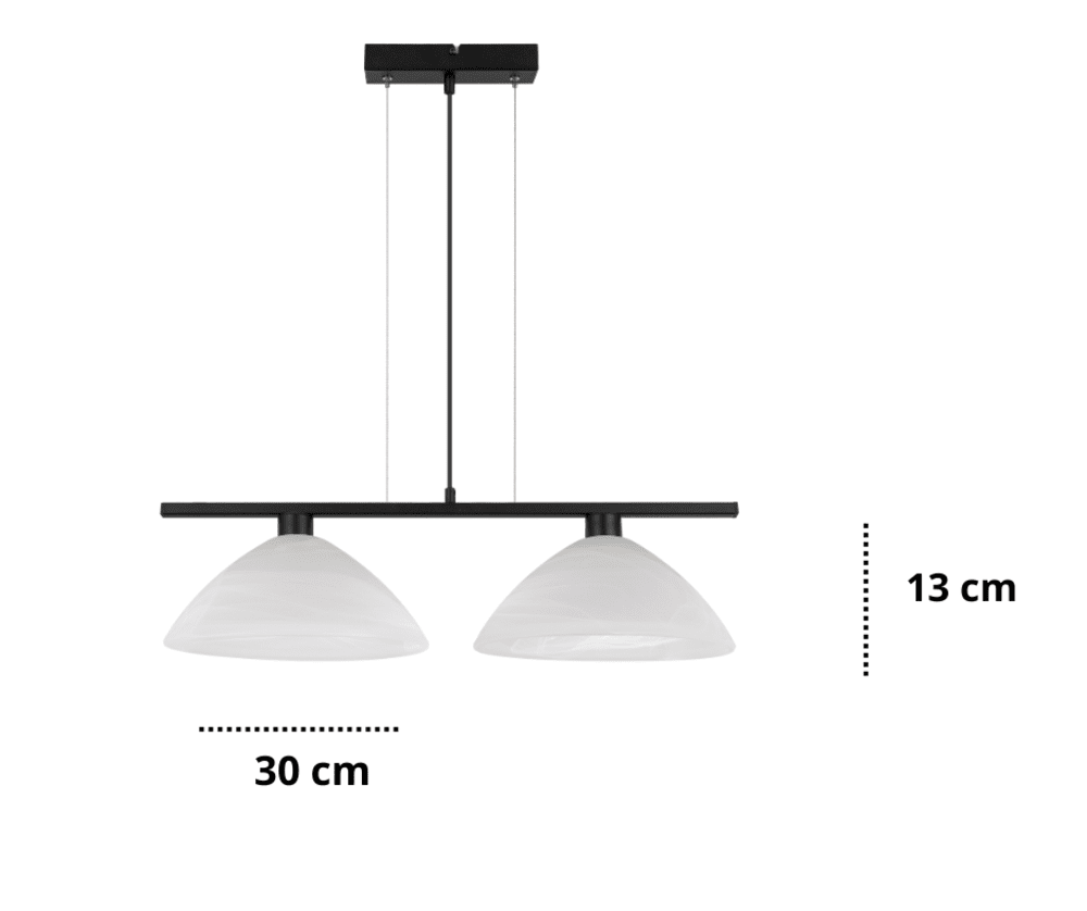 Wisząca lampa Werika wyposażona jest w czarny stelaż i dwa klosze szklane w kolorze białym matowym z delikatnymi smugami w stylu szkła Murano. W oprawie Werika zastosowano klosze w kształcie półkolistym, dzięki czemu światło żarówek oświetla dużą przestrzeń wokół i pod lampą. Jest to funkcjonalna lampa wisząca, która zachwyca eleganckim designem. Szklane klosze podwieszone do metalowego stelaża tworzą spójną, elegancką całość, a zastosowane w lampie dwa punkty oświetleniowe zapewniają doskonałe rozprowadzenie światła, które bez przeszkód rozprasza się przez jasne ścianki szklanych opraw. Czarna Lampa wisząca Werika jest dostępna także z białym stelażem i z trzema punktami światła. Lampa ze szklanymi kloszami świetnie sprawdzi się w niedużych kuchniach, w salonach i pokojach, i wszędzie tam, gdzie jest zbyt mało przestrzeni na duży wiszący żyrandol klasyczny czy dużą lampę wiszącą. Cała oprawa oświetleniowa produkowana jest w firmie Lampy-Juszczyk.