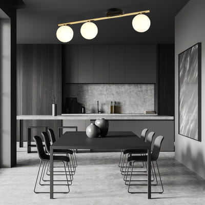 Lampa sufitowa ze szklanymi kulami Nozo idealnie sprawdzi się w niewysokich i nowoczesnych pomieszczeniach. Jest to oświetlenie podsufitowe z trzema białymi kloszami w kształcie kulek, które umieszczone są na złotym stelażu lampy. Kulisty, mlecznobiały klosz nałożony na żarówkę, powoduje, że światło rozpraszane jest równomiernie i nie razi wzroku. Lampa pod sufit ze szklanymi kulami Nozo doskonale sprawdzi się jako oświetlenie pokoju lub kuchni, urządzonej w stylu nowoczesnym i minimalistycznym. Lampa z kulami spełnia funkcję użytkową i dekoracyjną.