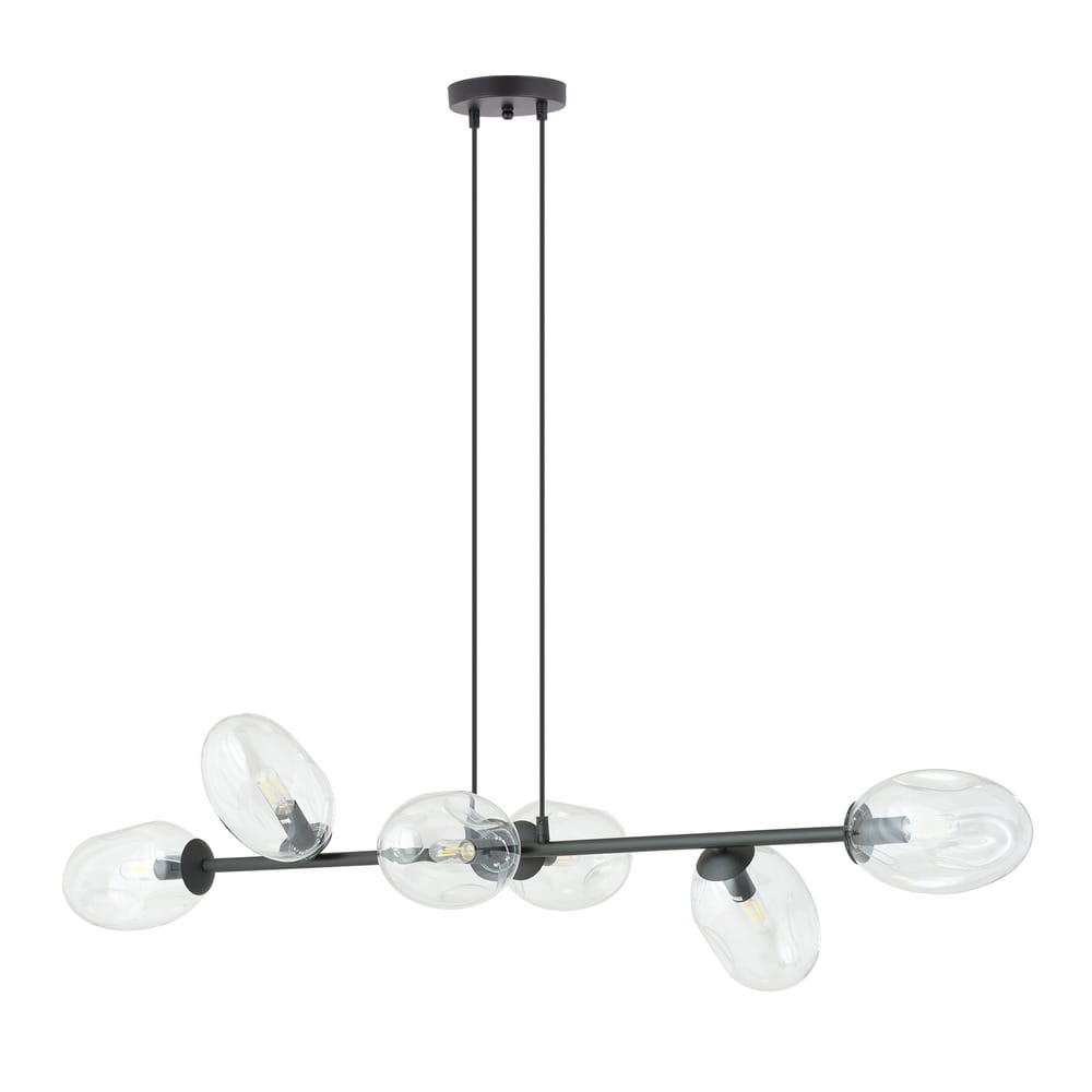 Dori to nasz bestseler, posiada sześć punkty światła, umieszczone na czarnym poziomym stelażu. Lampa ma szklane bezbarwne klosze i doskonale sprawdzi się jako oświetlenie w pomieszczeniach urządzonych w stylu nowoczesnym i modern. Dori to oprawa oświetleniowa, która często jest wybierana do jadalni i salonów. Posiada regulowaną wysokość. Oprawa ma uniwersalną kolorystykę, a sposób montażu i regulacji długości zawieszenia powodują, że lampa jest wieszana w standardowym budownictwie i w wysokich apartamentach. Prosta, a za razem funkcjonalna forma oświetlenia z szklanymi bańkami - kloszami, o futurystycznym designie i transparentnej barwie.