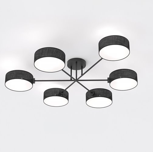 Lampa sufitowa Drim, niskie i nowoczesne pomieszczenia, spokojne kolory. Lampa na sufit w modnym kolorze czarnym. Sześć abażurów jest zaślepionych od spodu blendą, tak aby światło rozpraszało się równomiernie. Blendy są łatwe w montażu i doskonałe w utrzymaniu czystości lampy. Oświetlenie przysufitowe Drim odnajdzie swoje przeznaczenie we wszystkich salonach i jadalniach urządzonych w nowoczesnym stylu, ale o zbyt małej przestrzeni na lampę wiszącą, lub designerski żyrandol. Lampa Drim jest podłużną lampą pod sufit, tak że doskonale odnajdzie się w jadalniach nad stołem. Jako producent oświetlenia i fabryczny sklep z lampami, gwarantujemy jej jakość i sumienność wykonania, oraz zapewniamy ze nie jest to tzw. tania lampa z marketu.