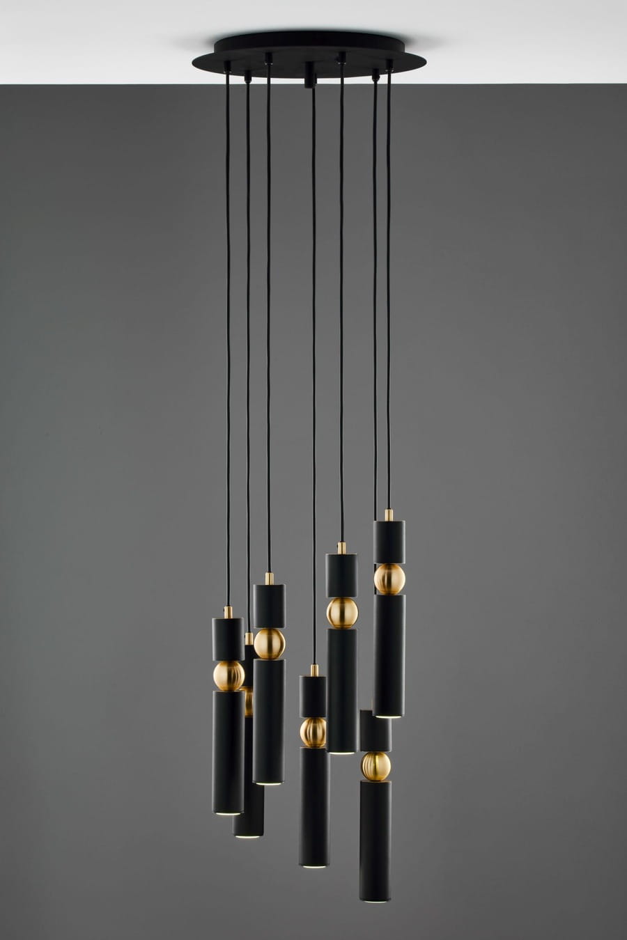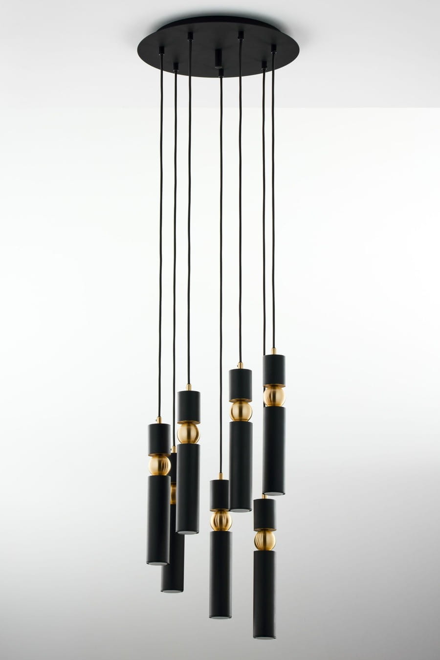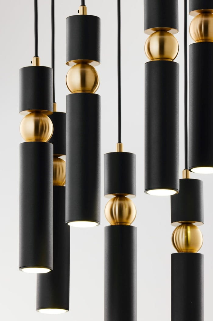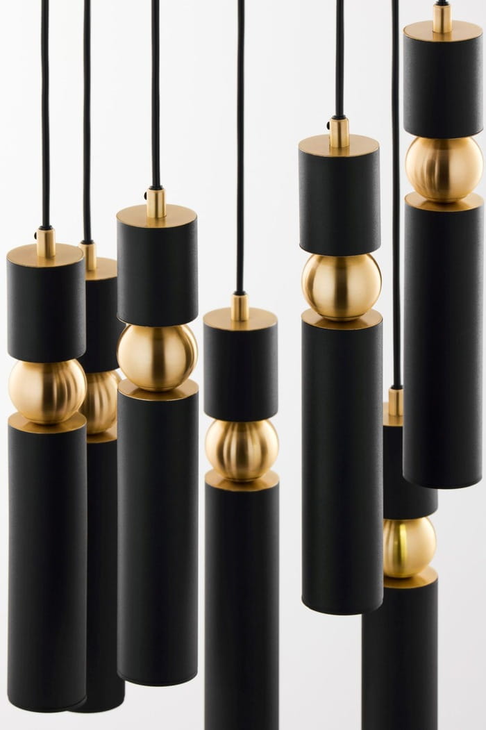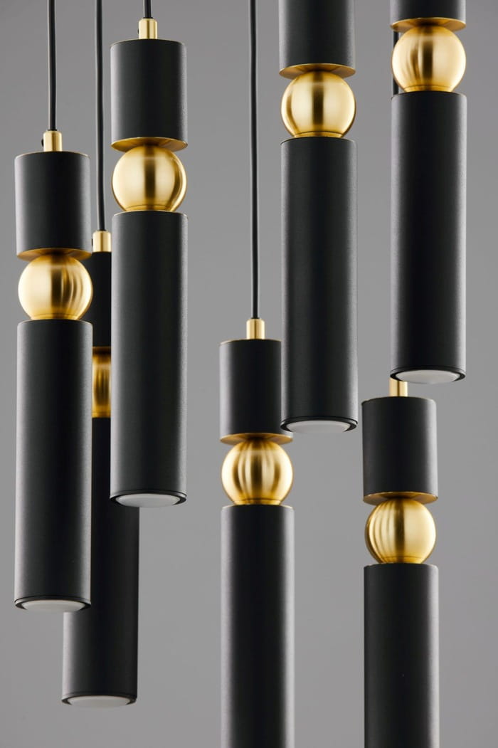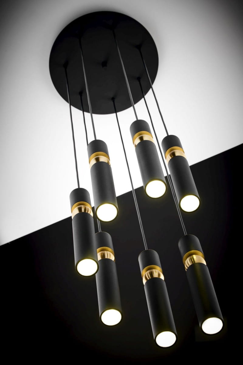 Nowoczesna lampa wisząca Talas to dekoracyjny spot z 7 tubami ledowymi, jest to bardzo efektowne oświetlenie w kolorze czarno-złotym. Jeden spot to jeden punkt światła. Lampa wiszący spot mocowana jest do sufitu poprzez okrągły czarny dekiel, przypominający talerz.  Óświetlenie posiada regulację wysokości, dzięki czemu można tę elegancką czarno-złotą lampę dopasować do indywidualnych preferencji. Designerska i minimalistyczna forma oświetlenia ze spotami sprawdzi się w pomieszczeniach nowoczesnych. Dzięki zastosowaniu połączenia czerni i eleganckiego złota jest to również nowoczesne oświetlenie w stylu glamour. Spot z 7 designerskimi tubami daje skoncentrowane, punktowe światło, dlatego lampy te często wybierane są jako oświetlenie spot nad stół lub jako lampy spot nad wyspę kuchenną. Lampa spot Talas jest również dostępna w wersji z pięcioma tubami i 3 punktami światła.