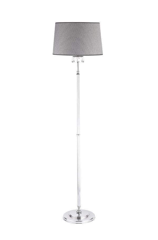 Lampa podłogowa srebrna Egidi. Duża lampa stojąca o prostym i uniwersalnym kształcie. Metalowa podstawa lampy podłogowej została wykonana starannie i elegancko, ozdabiają ją dodatkowe elementy - kryształki, a całość jest w kolorze chromu. Abażur do lampy jest zrobiony z certyfikowanego materiału w kolorze srebrno szarym. Lampa podłogowa jest doskonalą propozycją, do doświetlania przestronnego wnętrza salonu, pokoju, czy sypialni. Pozwoli nam odmienić swoje mieszkanie, będąc piękną dekoracją i dodatkowym źródłem światła.