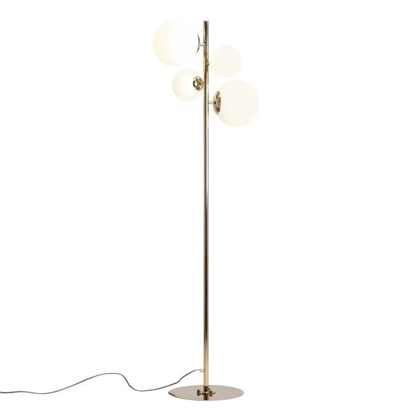 Nowoczesna lampa podłogowa Molo z czterema kloszami w kształcie kul to bardzo designerska w formie propozycja lampy stojącej. Podstawa lampy podłogowej jest w kolorze złotym, a klosze mlecznobiałe. Lampa stojąca Molo będzie idealnie pasowała do nowoczesnych salonów, gdzie zapewni dodatkowe przytulne światło. Lampa stojąca jest również elementem dekoracyjnym w pomieszczeniu, dodaje wnętrzu uroku i unikalnego stylu. Molo ma prostą formę oraz uniwersalną kolorystykę, która pasuje do wielu aranżacji wnętrz. Kule rozmieszczone wokół osi lampy precyzyjnie rozświetlają pomieszczenie i są ciekawą dekoracją.