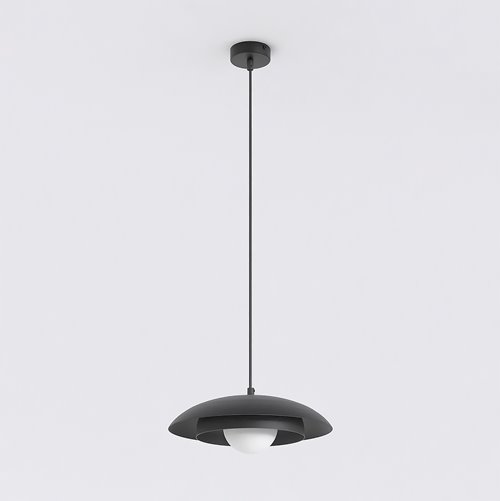 Lampa zwis Kini to czarna pojedyncza lampa wisząca z serii nowoczesnych lamp do pokoju. Jest to pojedynczy zwis metalowo-szklany, w którym zachwyt budzi prosta i oryginalna forma oświetlenia. Design pojedynczej lampy opiera się na pomyśle połączenia czystej bieli szklanego klosza z czarną barwą metalowego stelaża. Formę lampy tworzą także przemyślane kształty. Półokrągły abażur z metalu osłania okrągły szklany klosz Lampa pojedyncza ze szklanym kloszem doskonale nadaje się do nowoczesnych pokoi. Jest to nowoczesne oświetlenie do kuchni i designerska lampa nad stół. Zwis szklano-metalowy w kolorze czerni ozdobi pomieszczenia, w których tworzymy klimat nowoczesności.