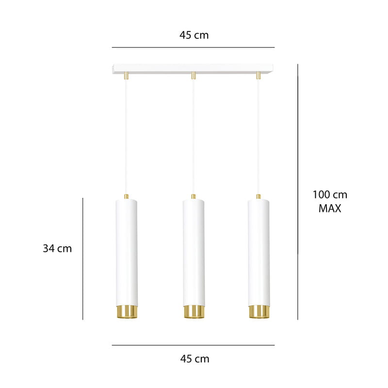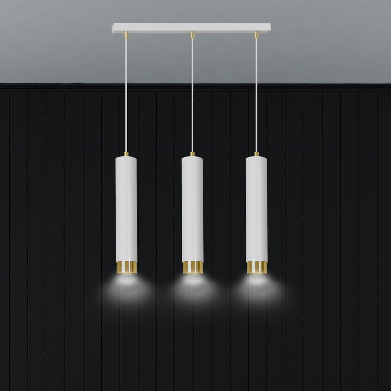 Kobo to spot wiszący na żarówki ledowe. Tuby są w kolorze białym ze złotymi dodatkami. Ta lampa to bardzo designerski, minimalistyczny i modny sposób na oświetlenie pomieszczeń. Oprawa oświetleniowa pasuje do każdego stylu wnętrz, od nowoczesnego po bardziej klasyczny. Daje skoncentrowane światło - dlatego jest często wieszana nad stołem, lub blatem kuchennym. Kobo posiada regulację wysokości.