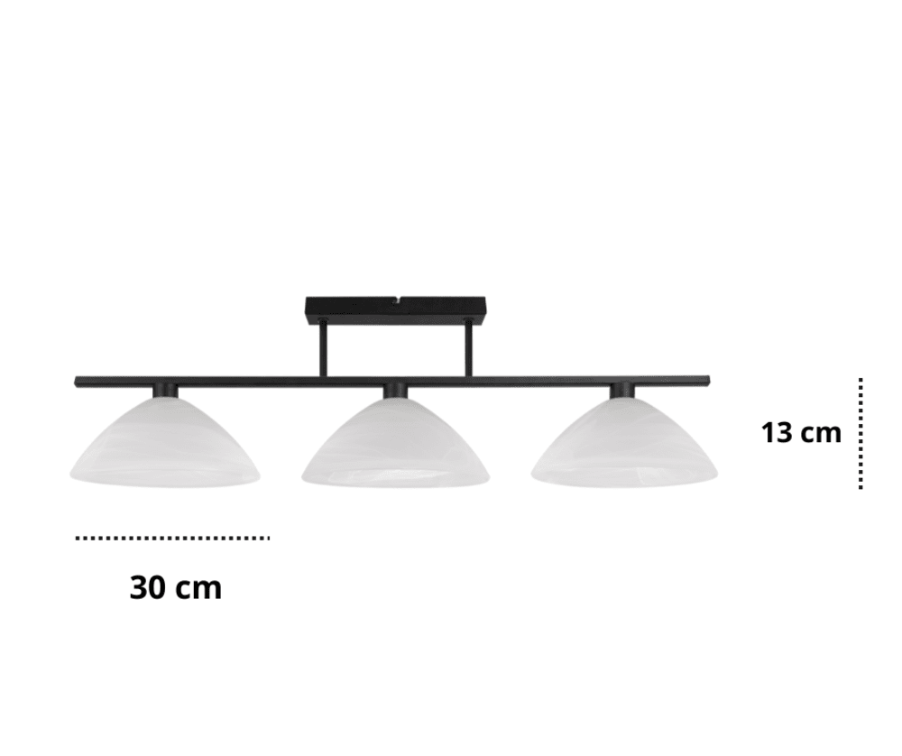 Podłużna lampa wyposażona jest w trzy klosze szklane w kolorze białym matowym z delikatnymi smugami w stylu szkła Murano. W oprawie Werika zastosowano klosze w kształcie półkolistym, dzięki czemu światło żarówek oświetla dużą przestrzeń wokół i pod lampą. Jest to funkcjonalna lampa sufitowa, która zachwyca eleganckim designem. Szklane klosze podwieszone do metalowego stelaża tworzą spójną, elegancką całość, a zastosowane w lampie trzy punkty oświetleniowe zapewniają doskonałe rozprowadzenie światła, które dodatkowo odbija się od jasnego wnętrza szklanych opraw. Wybierając lampę z białymi szklanymi kloszami warto dopasować inne dodatki w pokoju do koloru i struktury szkła tak, aby zachować spójność wystroju. Lampa sufitowa Werika jest dostępna także z białym stelażem.