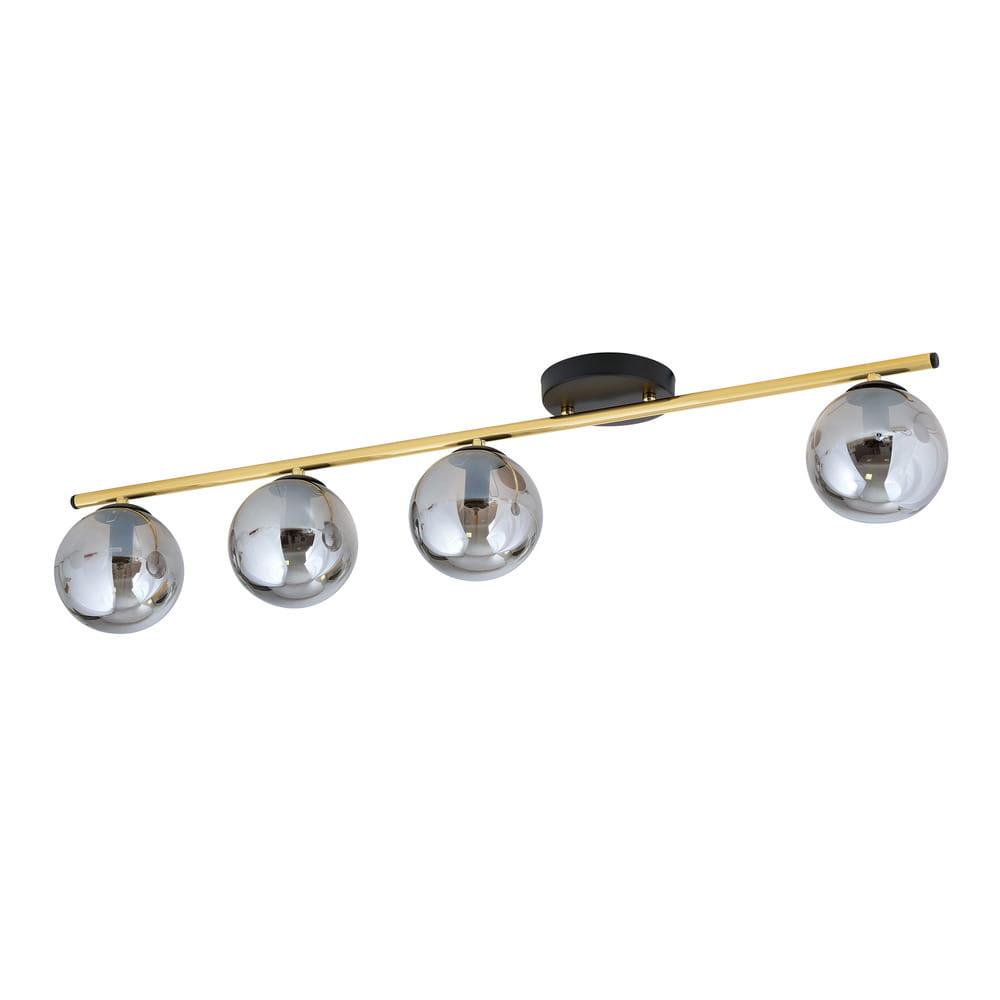 Lampa sufitowa Nozo to propozycja do pomieszczeń nowoczesnych i minimalistycznych. To modna oprawa oświetleniowa o podłużnym kształcie. Lampa z kulami Nozo posiada złoty prosty stelaż i cztery szklane kule, które rozmieszczone są w jego osi. Barwa i kształt kloszy zapewniają równomierne rozproszenie światła. Nozo pasuje do wielu stylów aranżacji mieszkań, można również oświetlić nią biura i pokoje hotelowe. Lampa z grafitowymi kulami polecana do niskich pomieszczeń, w których sprawdza się krótkie oświetlenie podsufitowe.