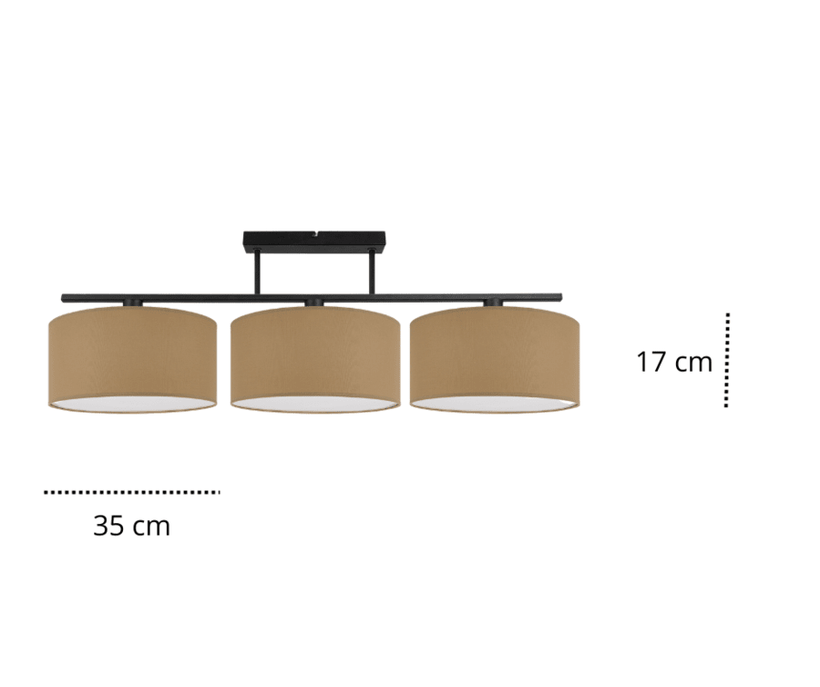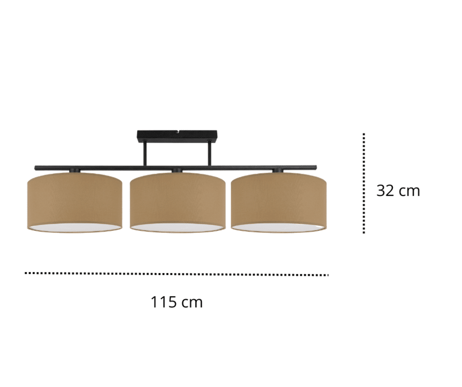 Lampa na sufit z rodziny Cappuccino posiada trzy abażury w kolorze " kawa z mlekiem :) ", które pasują do wielu aranżacji wnętrz. Klosze są od spodu zaślepione białą blendą z plexy. Jest to bardzo estetyczne rozwiązanie, gdyż nie widzimy żarówek, a światło rozprasza się równomiernie. Blenda jest łatwa w montażu i utrzymaniu czystości oprawy oświetleniowej. Oświetlenie przysufitowe ma trzy punkty światła, doskonale sprawdzi się w salonach, czy w dużych jadalniach, tam gdzie nie ma za dużo przestrzeni na lampę wiszącą, lub duży żyrandol. Cappuccino jest podłużną lampą na sufit, dlatego bardzo często jest wieszana nad stołem w kuchni. Nasza firma, jako producent lamp, poleca tę lampę pod sufit, którą można nabyć w naszym firmowym sklepie z lampami i gwarantujemy jej jakość i solidność, zapewniając że nie jest to tzw. tania lampa z marketu.