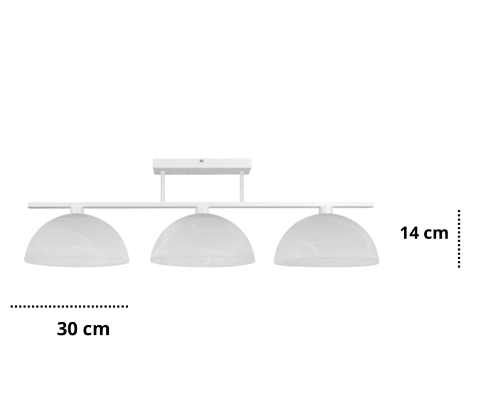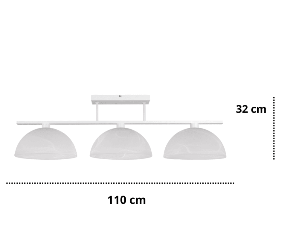 Podłużna lampa wyposażona jest w trzy klosze szklane w kolorze białym matowym z delikatnymi smugami w stylu szkła Murano. W oprawie Werika zastosowano klosze w kształcie półkolistym, dzięki czemu światło żarówek oświetla dużą przestrzeń wokół i pod lampą. Jest to funkcjonalna lampa sufitowa, która zachwyca eleganckim designem. Szklane klosze podwieszone do metalowego stelaża tworzą spójną, elegancką całość, a zastosowane w lampie trzy punkty oświetleniowe zapewniają doskonałe rozprowadzenie światła, które dodatkowo odbija się od jasnego wnętrza szklanych opraw. Wybierając lampę z białymi szklanymi kloszami warto dopasować inne dodatki w pokoju do koloru i struktury szkła tak, aby zachować spójność wystroju. Lampa sufitowa Werika jest dostępna także z czarnym stelażem.