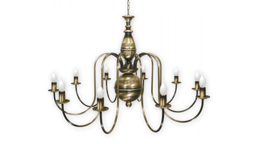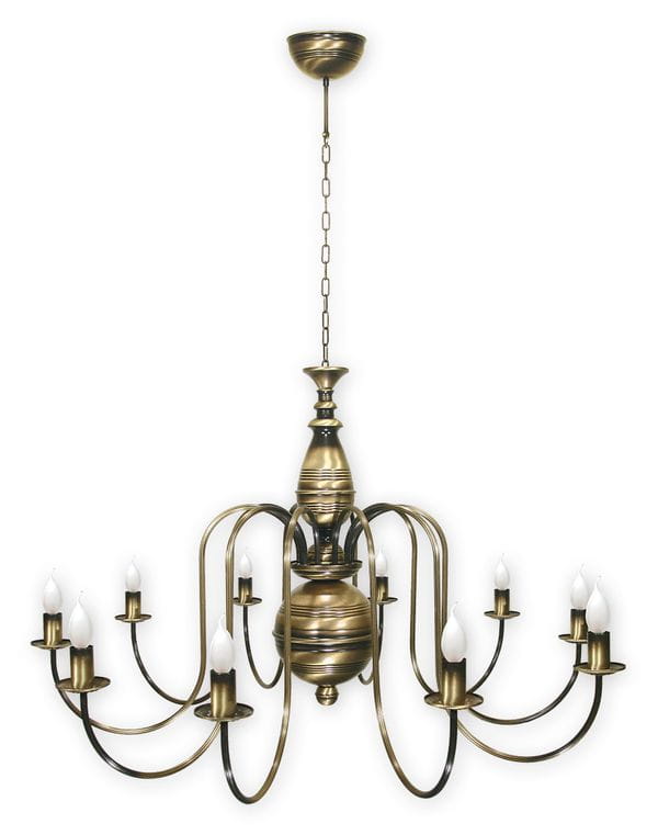 Candel max to żyrandol świecznikowy w dużym formacie. Lampa posiada 10 punków świetlnych i jest patynowana. Rurka, z której są zrobione ramiona, posiada dodatkowy element ozdobny - jest ryflowana, czyli ma charakterystyczne, eleganckie wgłębienia. Całość oprawy nawiązuje do klasycznych, kutych żyrandoli. Nasz Candel max to bardzo dobra oferta do oświetlenia kościołów, kaplic oraz plebanii. Cała oprawa ma średnicę ok 105 cm, a wysokość samego żyrandola to 70 cm. Długość łańcucha jest ustalana indywidualnie.