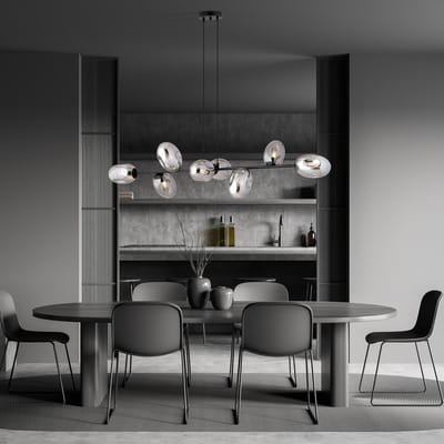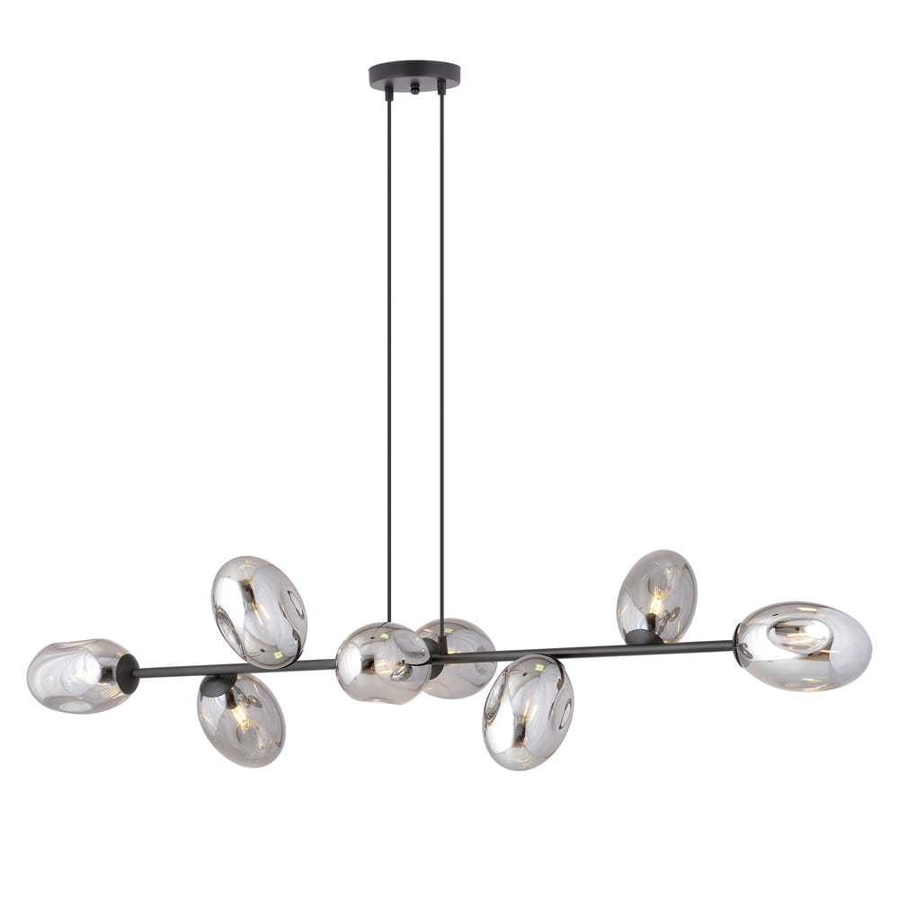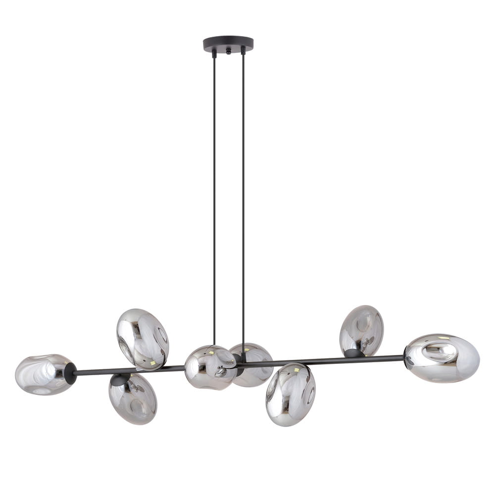 Dori to nasz bestseler, posiada osiem punkty światła, umieszczone na czarnym poziomym stelażu. Lampa ma szklane grafitowe klosze i doskonale sprawdzi się jako oświetlenie w pomieszczeniach urządzonych w stylu nowoczesnym i modern. Dori to oprawa oświetleniowa, która często jest wybierana do jadalni i salonów. Posiada regulowaną wysokość. Oprawa ma uniwersalną kolorystykę, a sposób montażu i regulacji długości zawieszenia powodują, że lampa jest wieszana w standardowym budownictwie i w wysokich apartamentach. Prosta, a za razem funkcjonalna forma oświetlenia z szklanymi grafitowymi bańkami - kloszami, o futurystycznym kształcie.