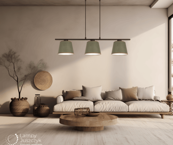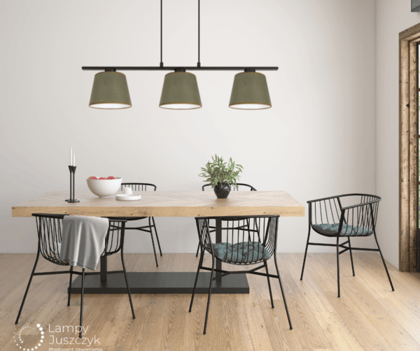Lampa wisząca potrójna LIKO to piękne i funkcjonalne oświetlenie do nowoczesnych pomieszczeń. Jest to lampa z trzema abażurami z weluru w kolorze ciemnej oliwki, dzięki którym światło żarówek jest delikatnie stłumione. Stelaż lampy jest zawieszony na przewodach, które możemy skrócić we własnym zakresie. Sposób mocowania lampy do sufitu daje więc możliwość dopasowania oświetlenia do wysokości pomieszczenia. Nowoczesna lampa wisząca Liko doskonale sprawdzi się jako lampa z abażurami nad stół, jako oświetlenie w salonie, w kuchni, jako nowoczesna lampa do pokoju dziecięcego i jako czarna lampa młodzieżowa. Trzy punkty światła zapewniają odpowiednia ilość światła w pomieszczeniu. Dzięki nowoczesnemu, geometrycznemu kształtowi stelaża i abażurków lampa Liko będzie się dobrze komponować się z wystrojem nowoczesnym, industrialnym i skandynawskim.