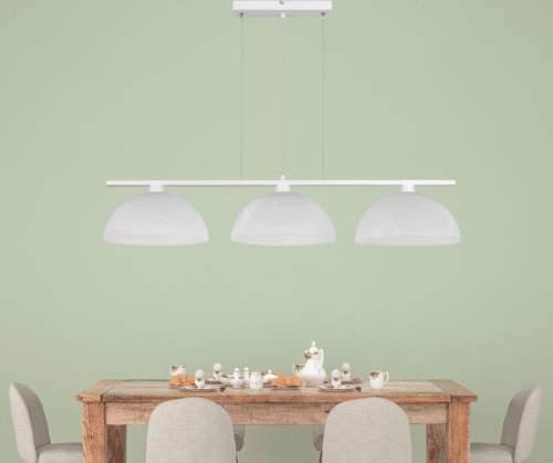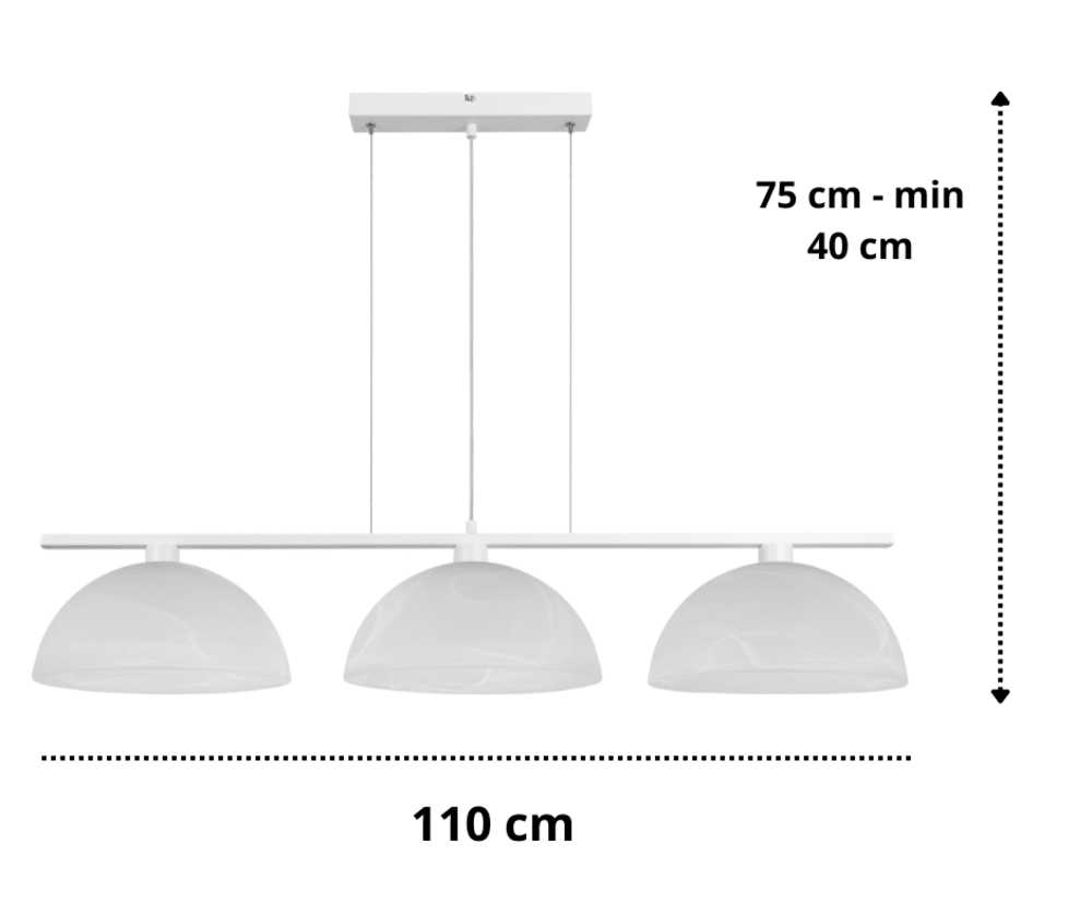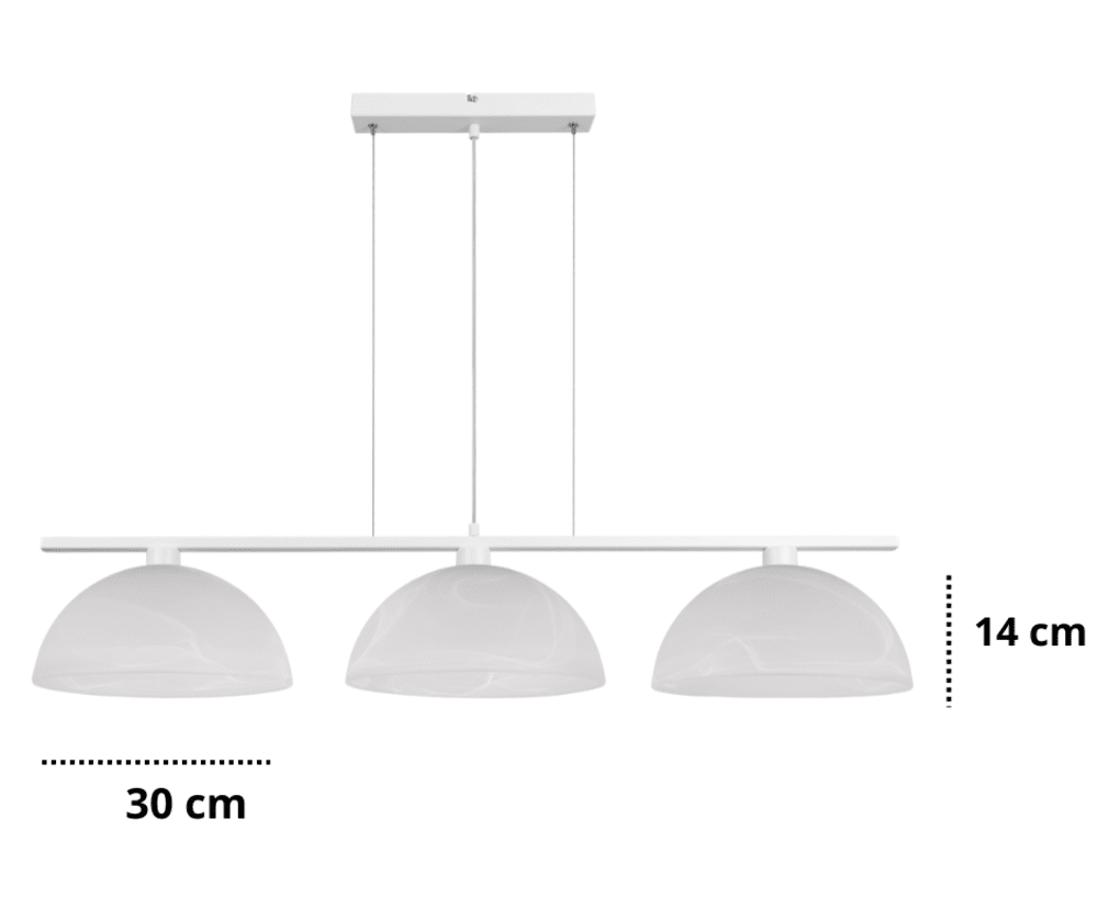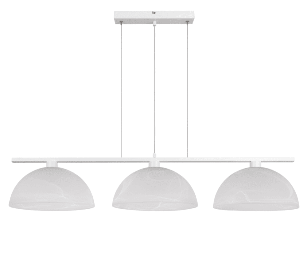 Lampa Westyn to żyrandol wiszący z białym stelażem i trzema szklanymi kloszami w odcieniu półprzezroczystej bieli. Jest to duża, podłużna lampa, która doskonale sprawdzi się jako nowoczesne oświetlenie do kuchni, jako potrójna lampa nad stół lub jako oprawa oświetleniowa do jasnego salonu i pokoju. Białe wybarwienie szklanych kloszy zapewnia doskonałe oświetlenie przestrzeni bezpośrednio pod, jak i wokół lampy. Szkło kloszy jest półmatowo białe, dodatkowym ornamentem na misie kloszy są delikatne białe smugi, które dodają im charakteru szkła w stylu Murano. Lampa Westyn wyposażona jest w prosty i elegancki metalowy stelaż, który stabilnie podtrzymuje trzy duże punkty światła. Jest to nowoczesna prosta lampa wisząca, która doskonale dopasuje się do wielu pomieszczeń urządzonych w stylu klasycznym, nowoczesnym i skandynawskim.