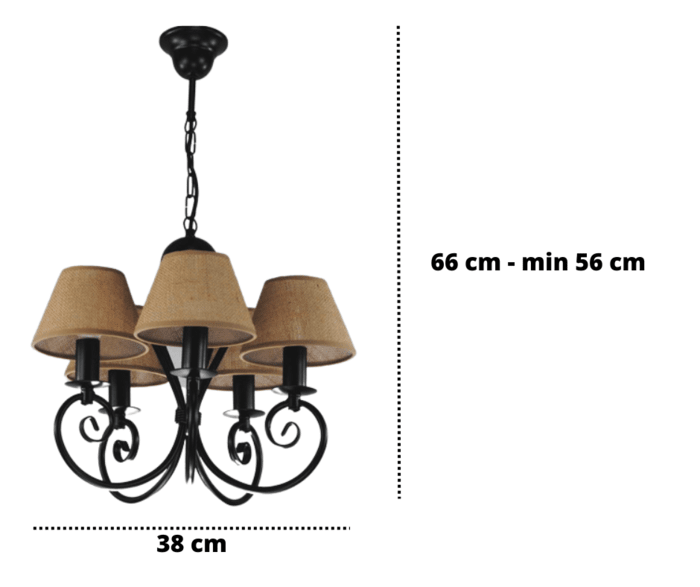 Żyrandol Klinos to klasyczna lampa do pokoju, której stelaż wyposażony jest w pięć subtelnie wygiętych ramion i 5 punktów światła. Stelaż lampy jest w kolorze czarnym matowym. Punkty światła osłonięte są abażurkami w kolorze juty, dzięki czemu światło żarówek jest łagodnie rozproszone i nie razi oczu. Lampa wisząca ma 66 cm długości, ale może być skrócona poprzez odjęcie 3 ogniwek łańcucha. Żyrandol do salonu z abażurami Klinos pięknie prezentuje się w sypialni, w kuchni i w niewielkim salonie, gdzie wraz z jasnymi i naturalnymi dodatkami stworzy spójną kompozycję przytulnego wystroju. Jest to klasyczny żyrandol w modnym stylu naturalnym - eco.